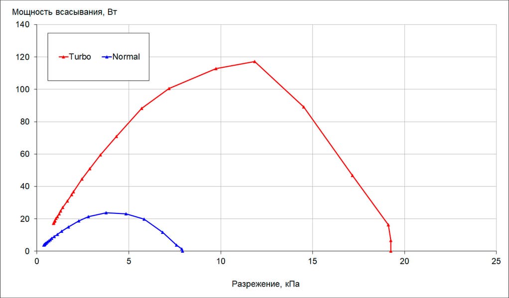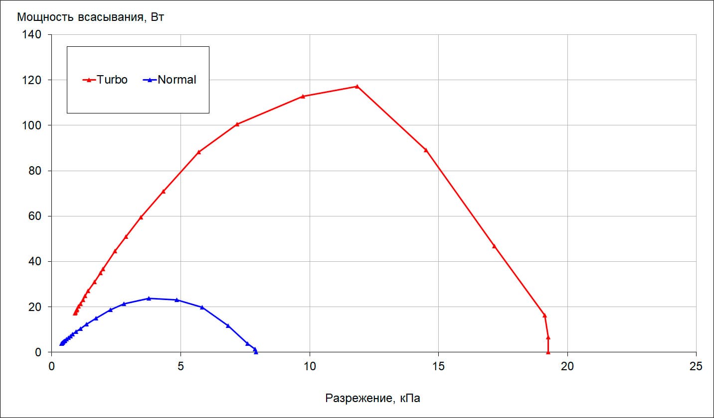Мощность всасывания (что это такое и как мы ее измеряем, описано в отдельной статье) мы определяли при работе пылесоса без трубы и насадок. Зависимость мощности всасывания от создаваемого разрежения приведена на графике ниже: