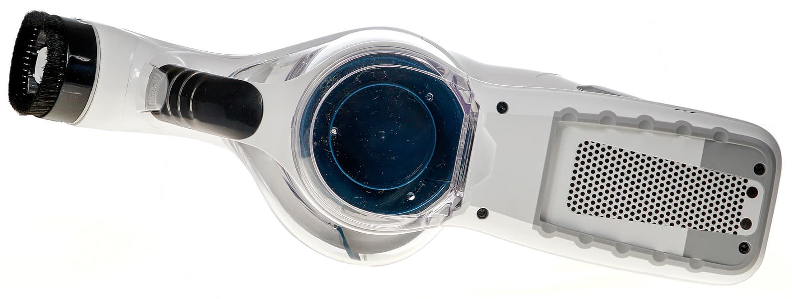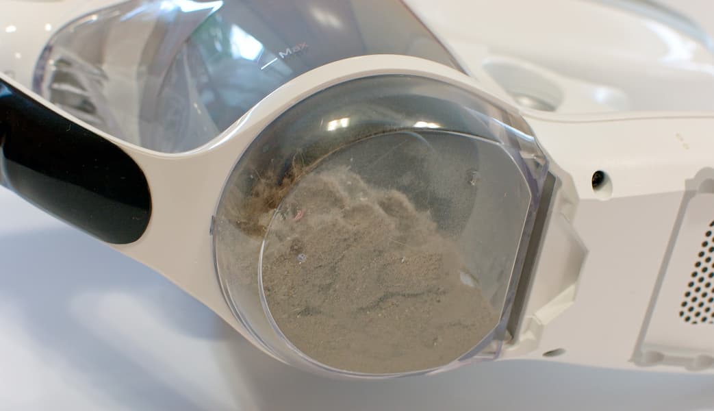 Корпус пылесборника позволяет оценить степень его заполнения с первого взгляда, по крайней мере, пока он не сильно поцарапался изнутри. Производитель указывает, что его объем равен 0,65 л, но это, видимо, полный объем. Мы налили воды до отметки Max и, вылив, измерили ее объем — он был равен 260 мл. Это очень мало: пылесборник точно придется вытряхивать после каждой уборки, а если в помещении не очень чисто — вполне возможно, еще и в процессе.