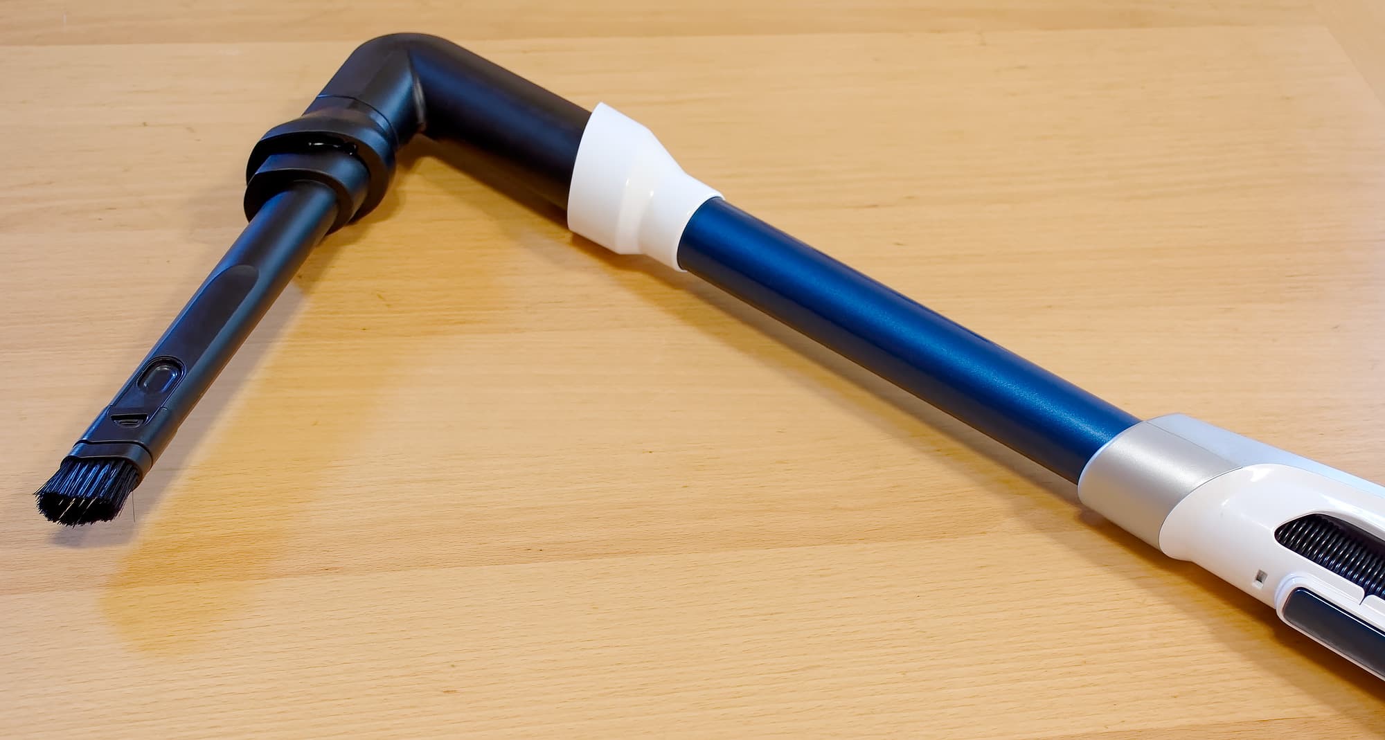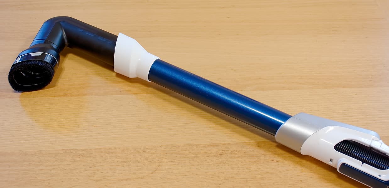 Сгибающаяся удлинительная труба действительно позволяет ловко «пролезать» в различные труднодоступные места и придает процессу уборки существенный дополнительный комфорт: многие вещи, которые в иных случаях мы бы передвигали с места на место, в этом случае можно было не трогать. Кнопка, переводящая трубу в гибкий режим, находится в удобном месте, а в выпрямленное положение труба защелкивается сама после полного выпрямления — все интуитивно понятно и естественно. Полноценно описать наши впечатления словами сложно, можем только сказать, что тестируя те пылесосы, где такой функции нет, мы точно будем по ней скучать.