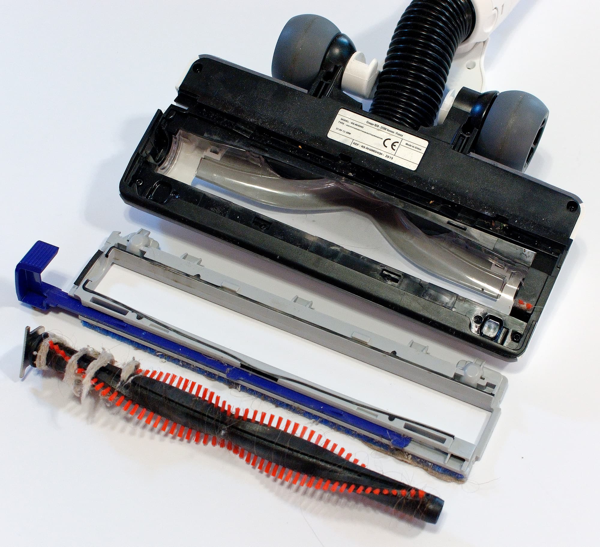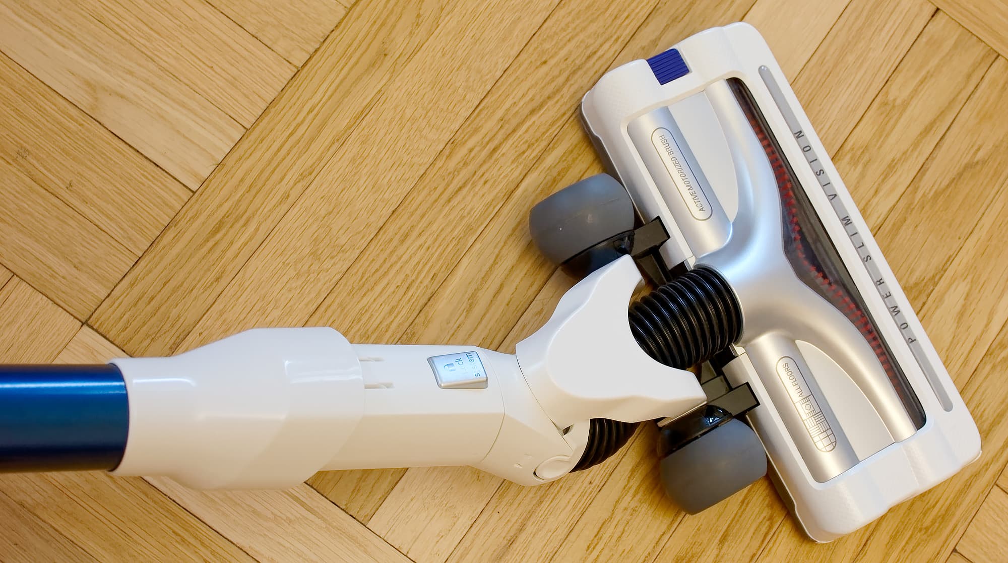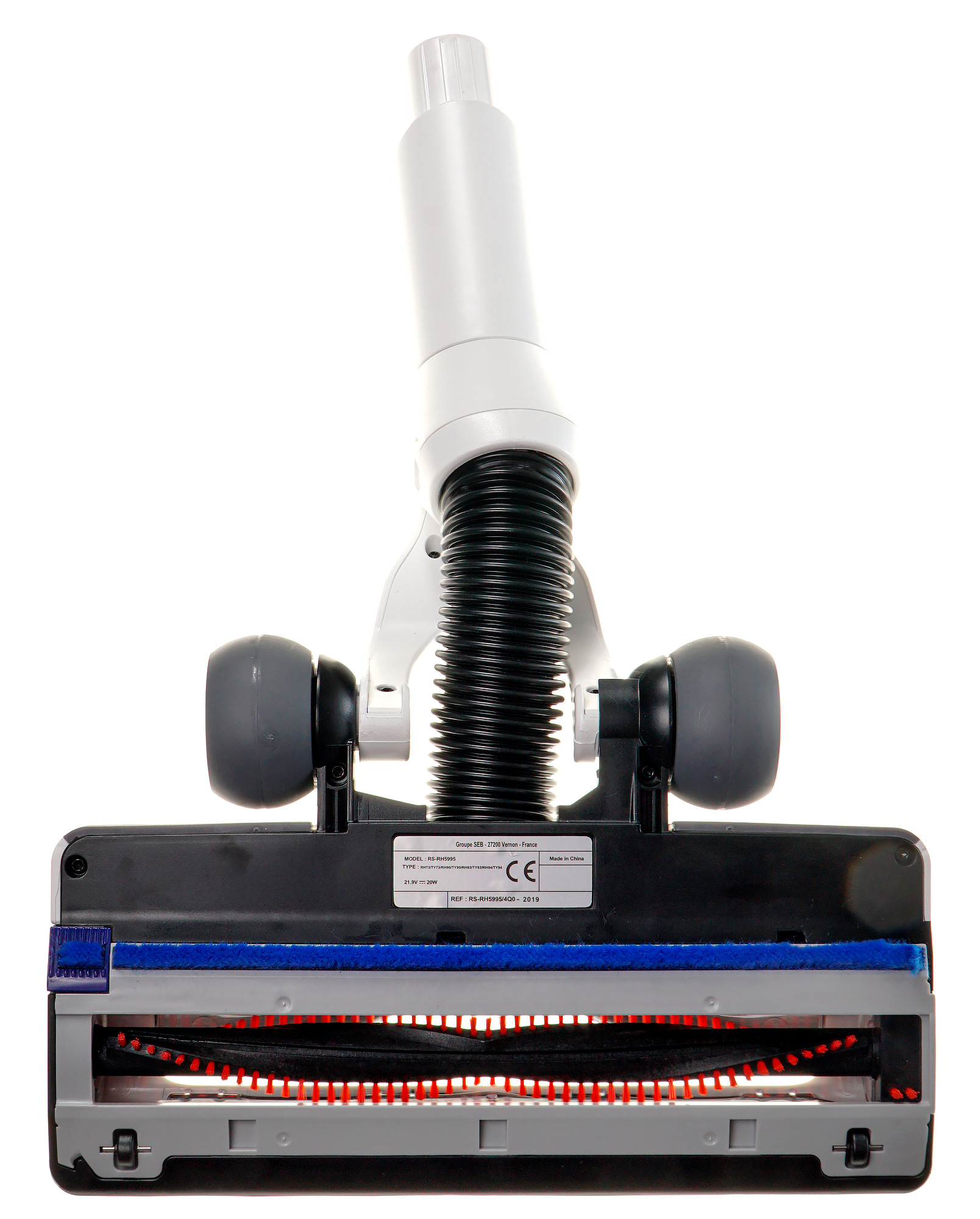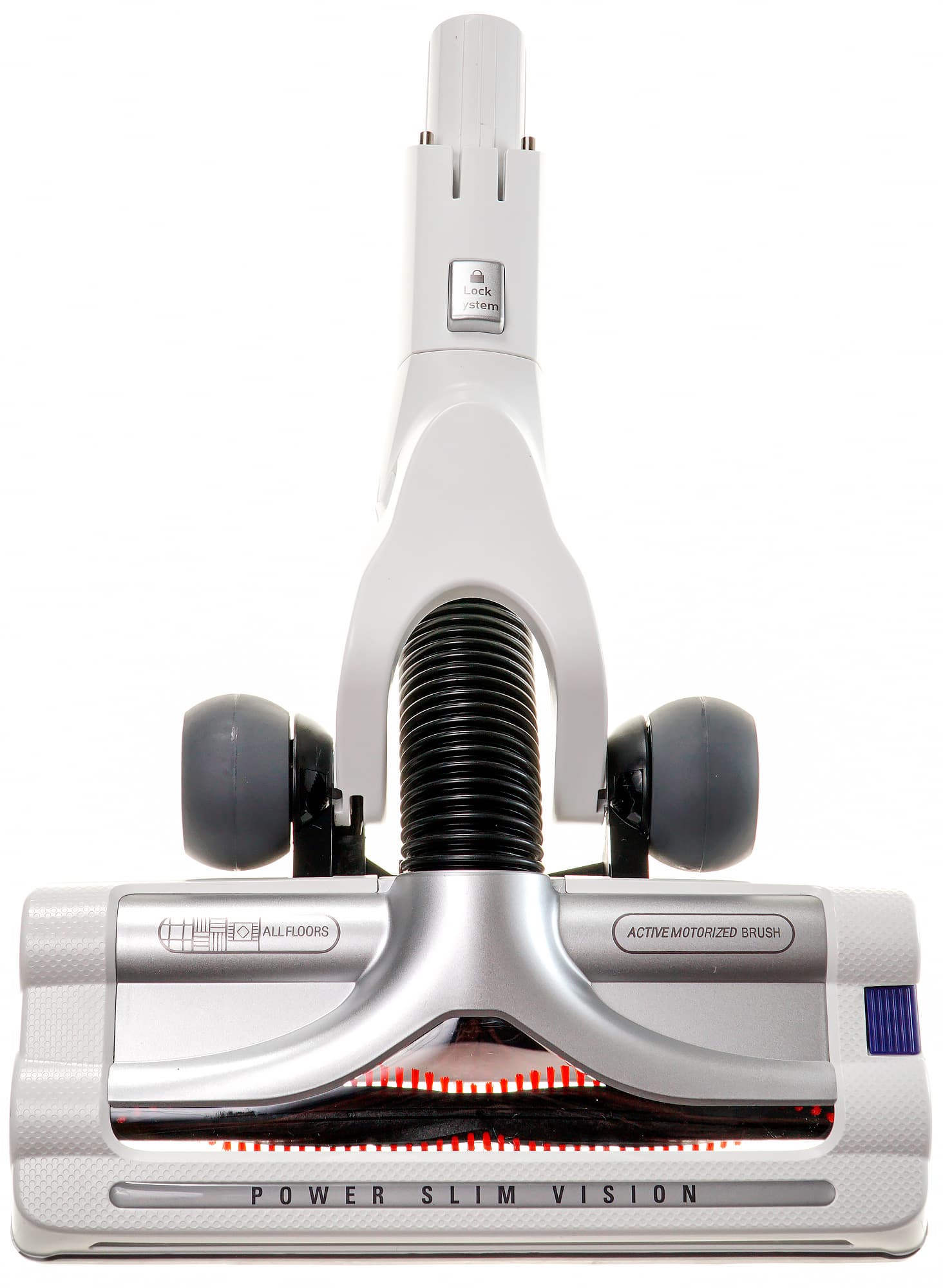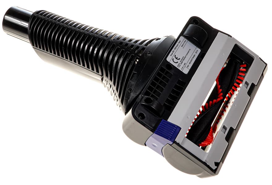 Ширина всей электрощетки 250 мм, вращающейся щетки — 220 мм. Скользить по полу ей помогают два жестких пластиковых ролика спереди и два резиновых колесика сзади. Питание для электромотора и подсветки передается от основного блока по проводникам в трубке, но при необходимости электрощетку можно закрепить непосредственно на основном блоке.