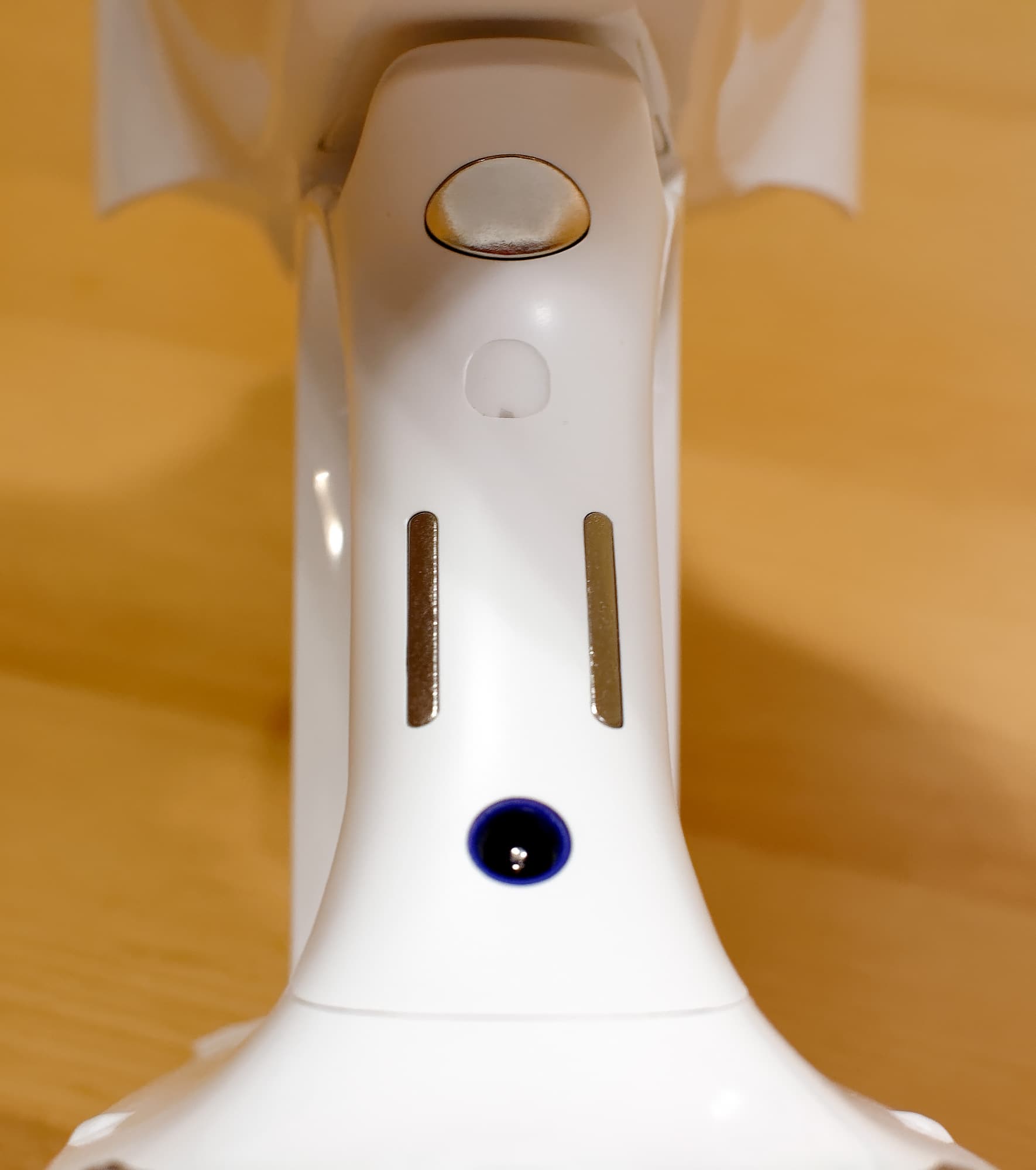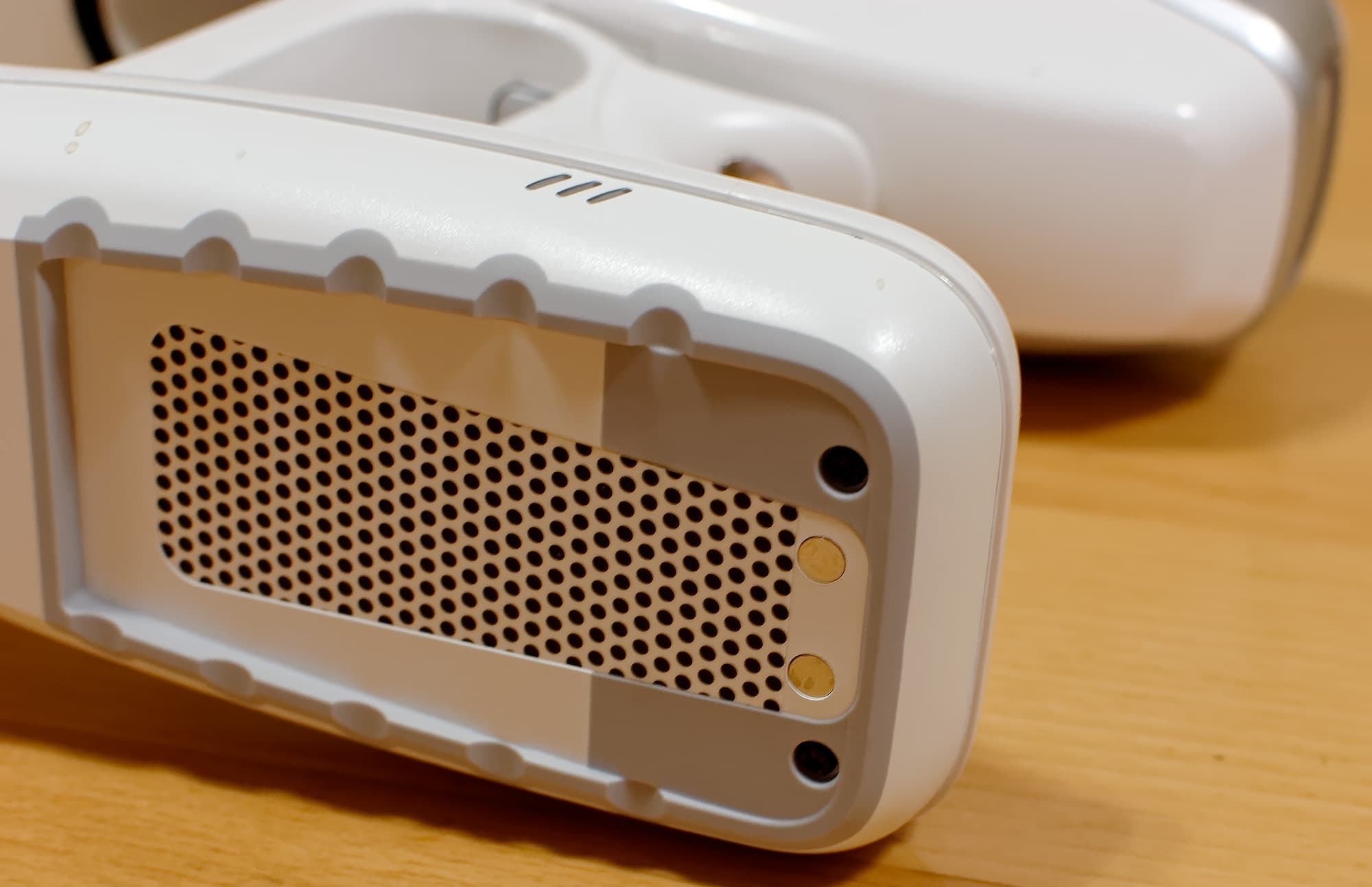 Индикация зарядки аккумулятора не очень информативная: две синих полоски внизу корпуса (видны как черные на фото выше) светятся во время зарядки, гаснут после ее завершения, светятся в процессе работы и начинают мигать незадолго до того, как аккумулятор сядет полностью.