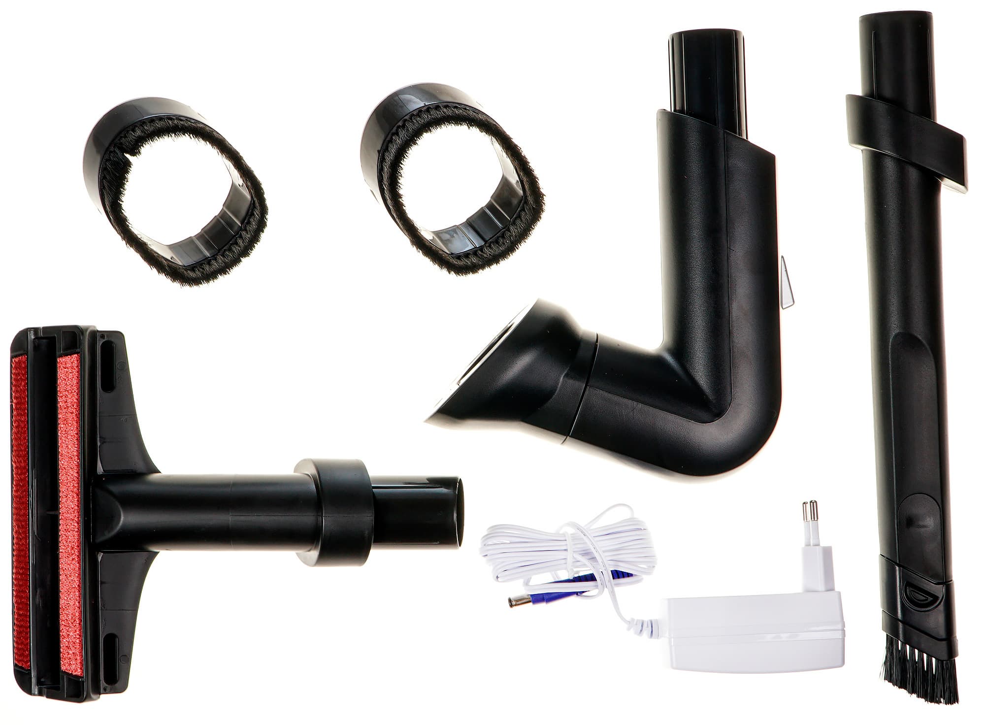 Большая и малая электрощетки, а также насадка для уборки высоких мест имеют защелки, остальные ими не оснащены.