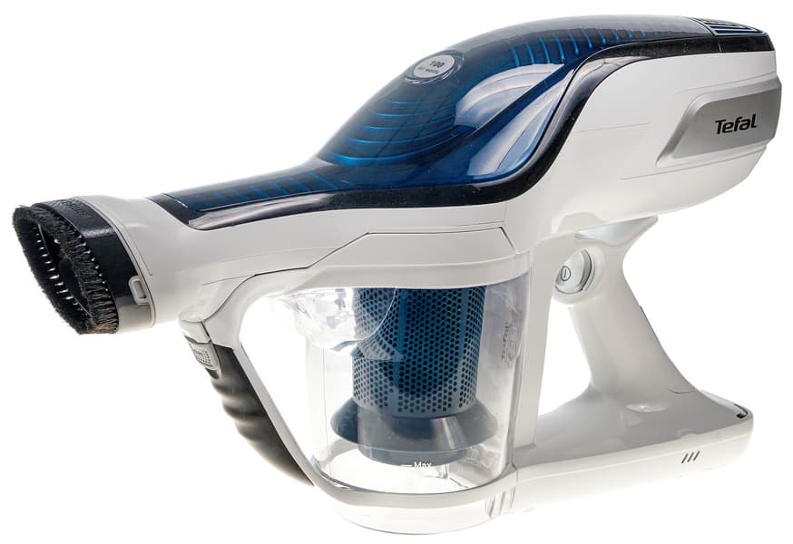 Рассматриваемая нами сегодня модель аккумуляторного вертикального пылесоса — топовая для Tefal (по крайней мере, найти более дорогую нам не удалось). У нее заявлена довольно высокая мощность всасывания (100 АВт), продолжительное время работы (35 минут) и короткое — зарядки (3 часа). Характеристики вполне под стать верхнему сегменту, но цена при этом на удивление гуманная.