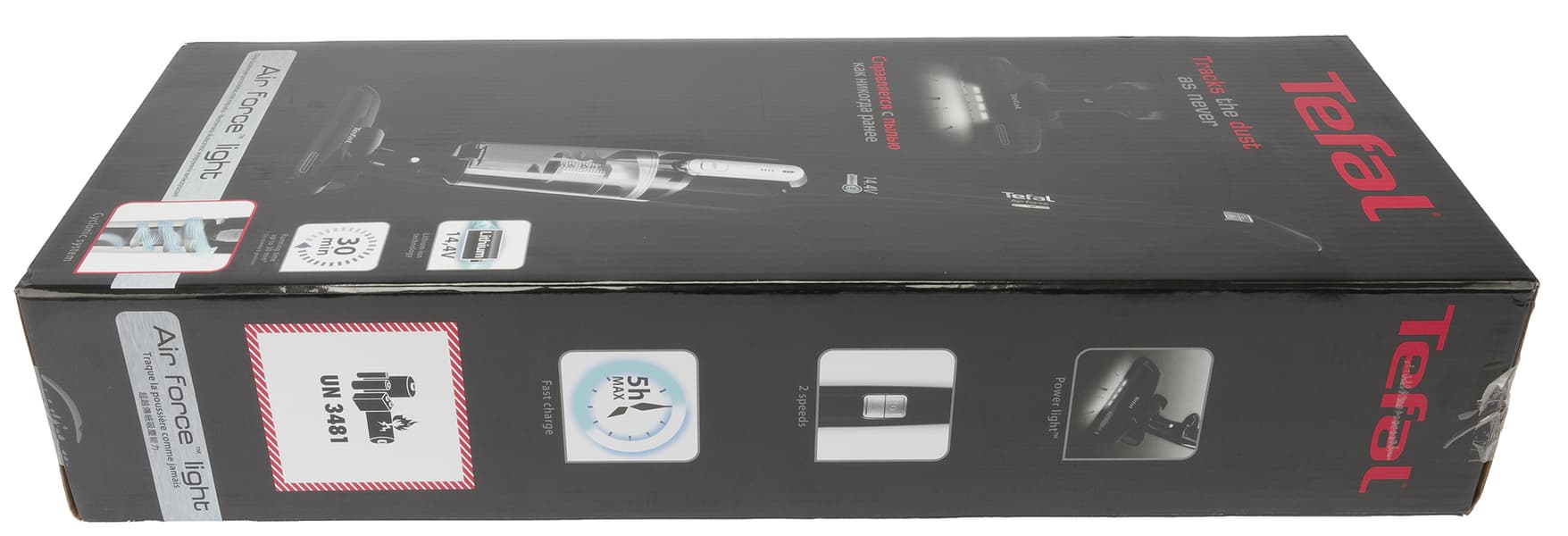 Tefal Air Force Light TY6545RH поставляется в картонной коробке с узнаваемым фирменным логотипом и полноцветной печатью. На передней и задней сторонах упаковки мы видим изображение нашего пылесоса, а на боковых перечислены основные особенности модели: небольшой вес, высокая маневренность, два уровня мощности и наличие подсветки рабочей зоны.