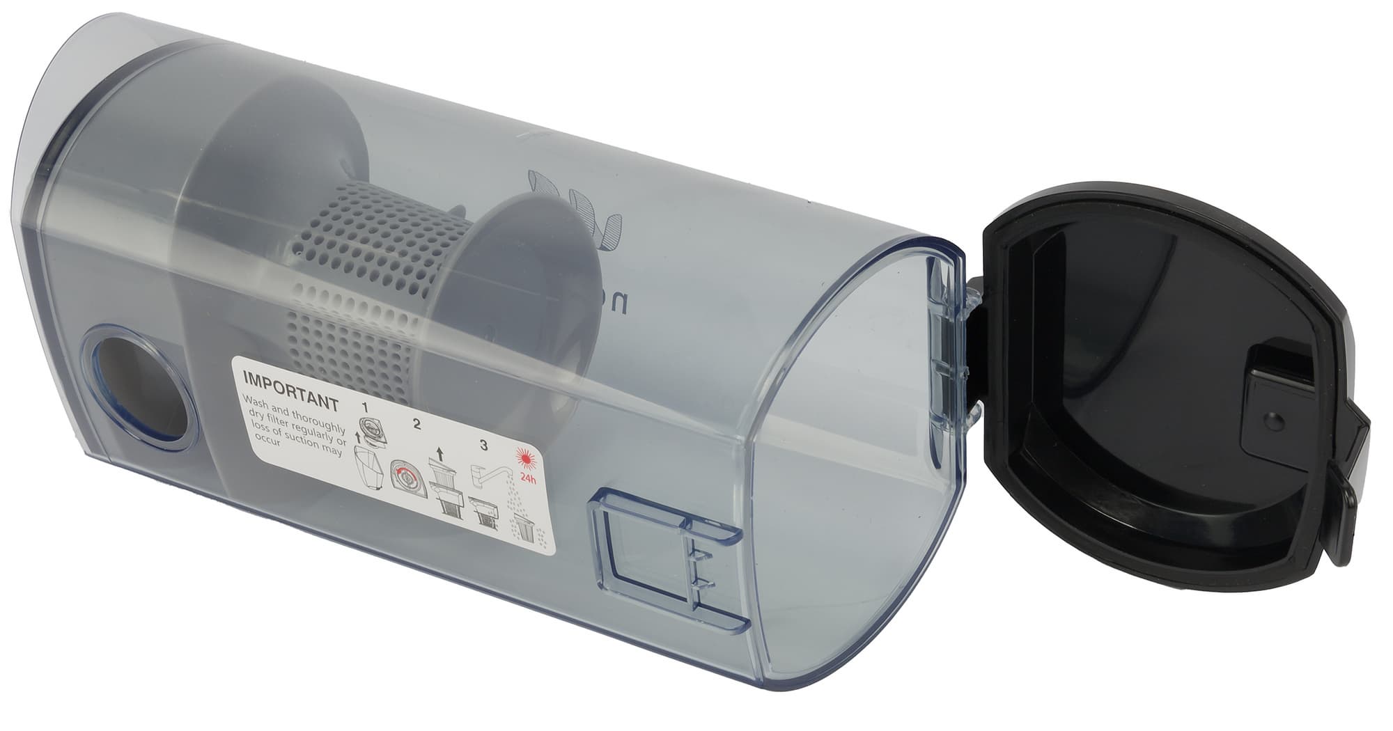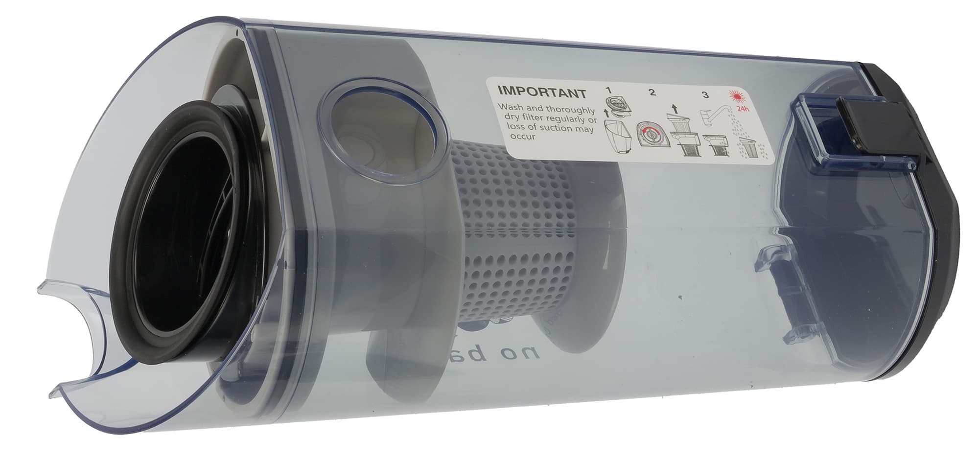 Внутреннюю поверхность мусоросборника и циклонный элемент можно мыть без ограничений, тщательно высушивая перед сборкой и установкой.