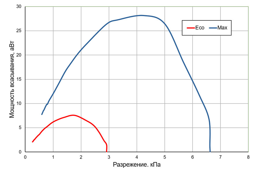 Мощность всасывания (что это такое и как ее измеряем, описано в отдельной статье) мы определяли при работе пылесоса без трубы и насадок, в обоих режимах. Зависимость мощности всасывания от создаваемого разрежения приведена на графике ниже: