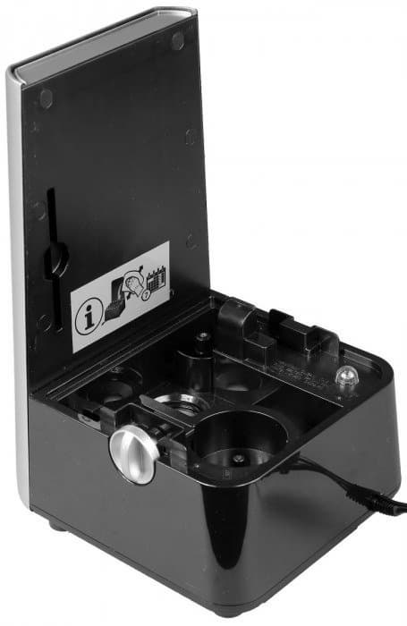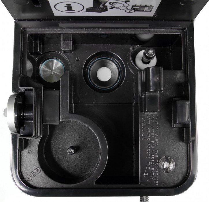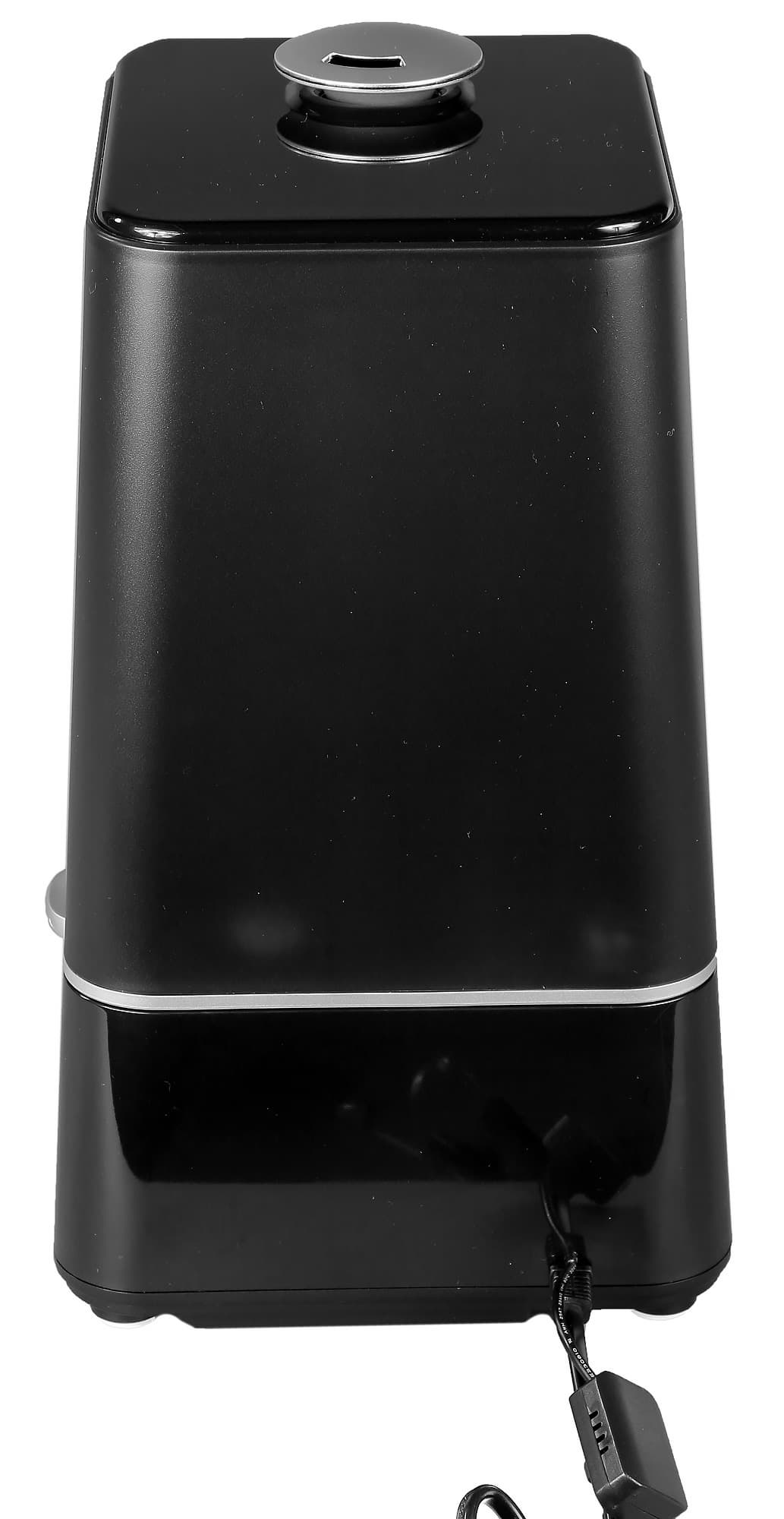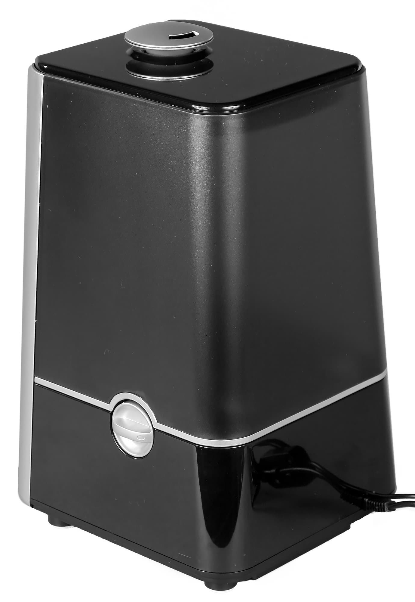 Увлажнитель выглядит стильно и современно за счет сочетания глянцевого черного пластика и серебристых акцентов на корпусе. Форма трапеции со скругленными краями делает прибор не только симпатичным, но безопасным для всех членов семьи. Полупрозрачный черный бачок не имеет отметок минимума и максимума, но они и не нужны, как мы увидим дальше. Электрический провод длиной 140 см легко дотянется до ближайшей розетки, но спрятать лишнюю длину некуда.
