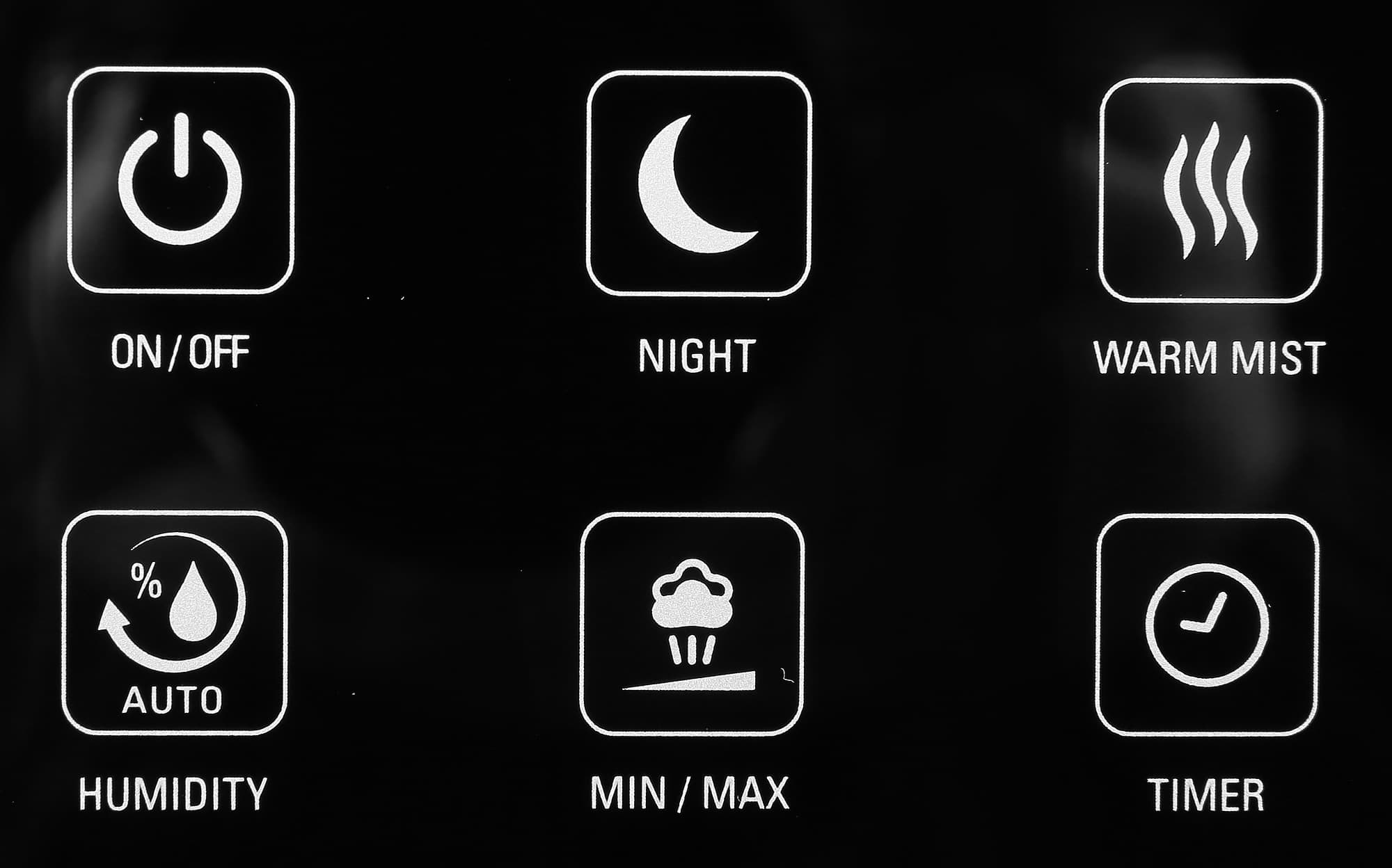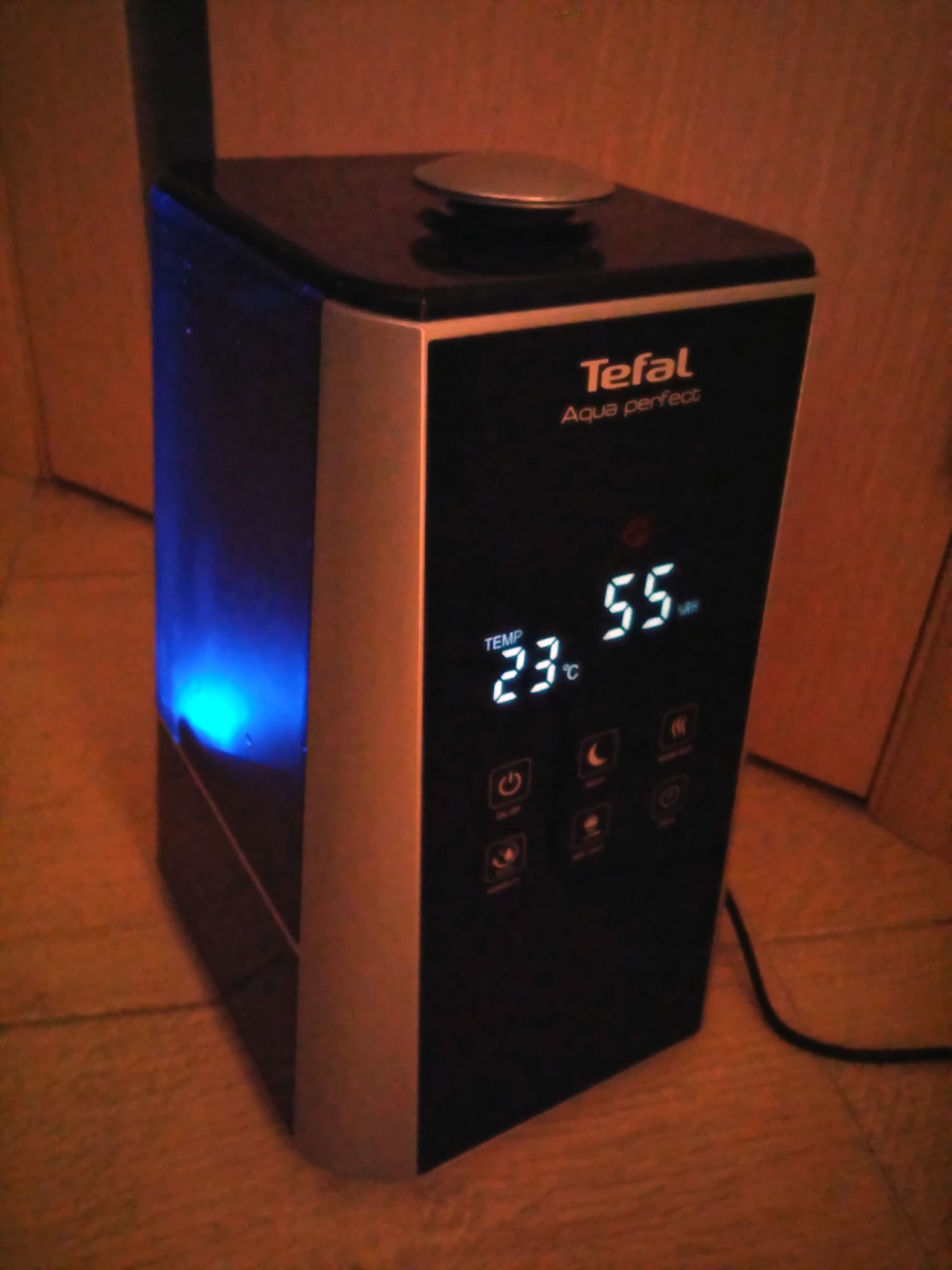 Резервуар для воды рассчитан на рабочий объем от 1,9 до 5,86 литров и при максимальном заполнении обеспечивает увлажнение в течение ночи и всего утра. Отметок на поверхности бачка нет, но благодаря внутренней подсветке уровень воды легко увидеть, а датчик подаст сигнал при нехватке воды и автоматически отключит прибор. Подсветка дисплея достаточно яркая, чтобы легко различить символы при свете, а спустя 5 секунд бездействия она становится более слабой, чтобы не привлекать к себе внимания даже в темноте.