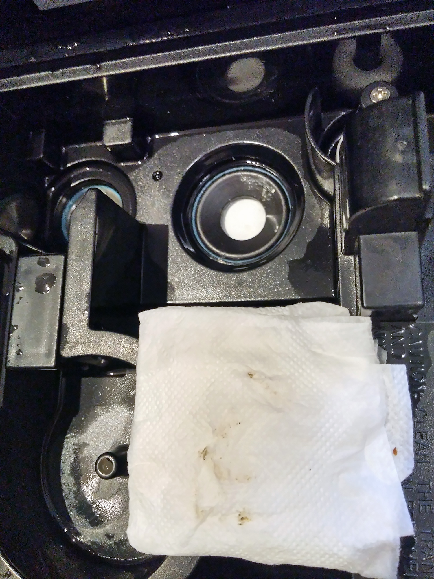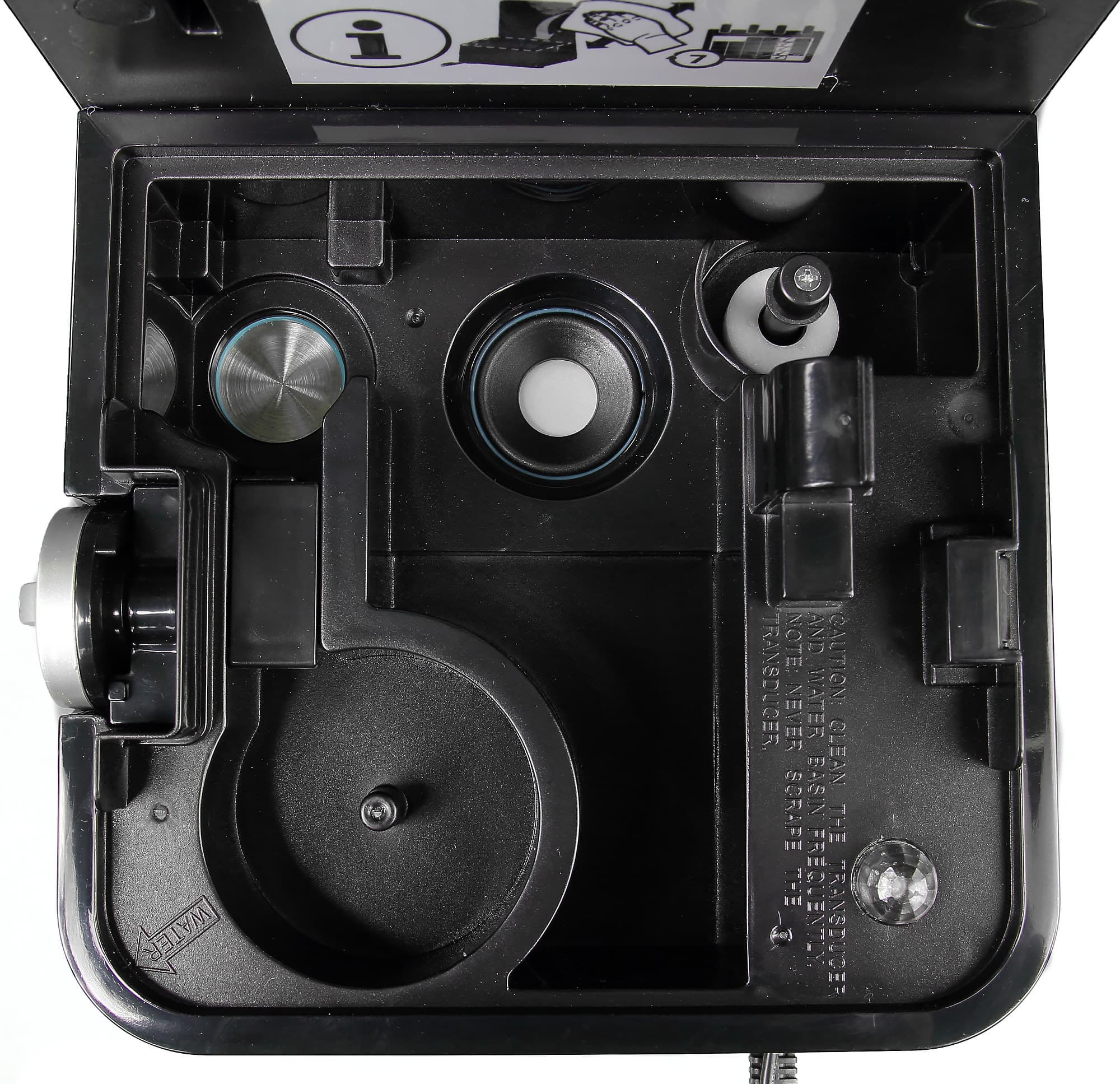 Разобравшись с расположением воды, мы стали изучать требования к ее качеству. Чтобы предотвратить появление известкового налета, производитель рекомендует очищенную от солей воду: дистиллированную или кипяченую. Мы неделю тестировали прибор, используя обычную воду из-под крана в сравнительно новом доме, и смогли обнаружить признаки загрязнений в зоне пьезоэлектрической пластины. Наш эксперимент связан с тем, что в Санкт-Петербурге очень мягкая вода, но и она не спасает от осадка, поэтому рекомендуем хотя бы пропускать ее через фильтр — ведь что наливаем в бак, тем и дышим.
