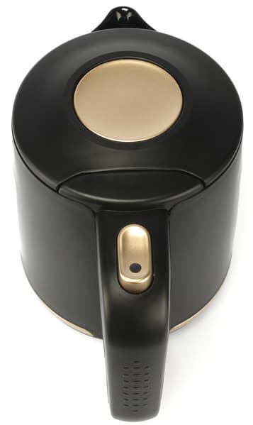 Наш чайник имеет очень скромные размеры — всего 20,5 сантиметров в высоту. Устройство приятно держать в руках, корпус сделан из черного матового пластика, на котором не остается отпечатков. Вставки из золотистого пластика на дне устройства, на крышке и на ручке добавляют ему шарма. Градуировка на окошках нанесена крупным черным шрифтом, который отлично видно. Качественная сборка — отсутствие люфтов и щелей — тоже оставляют от него приятное впечатление.