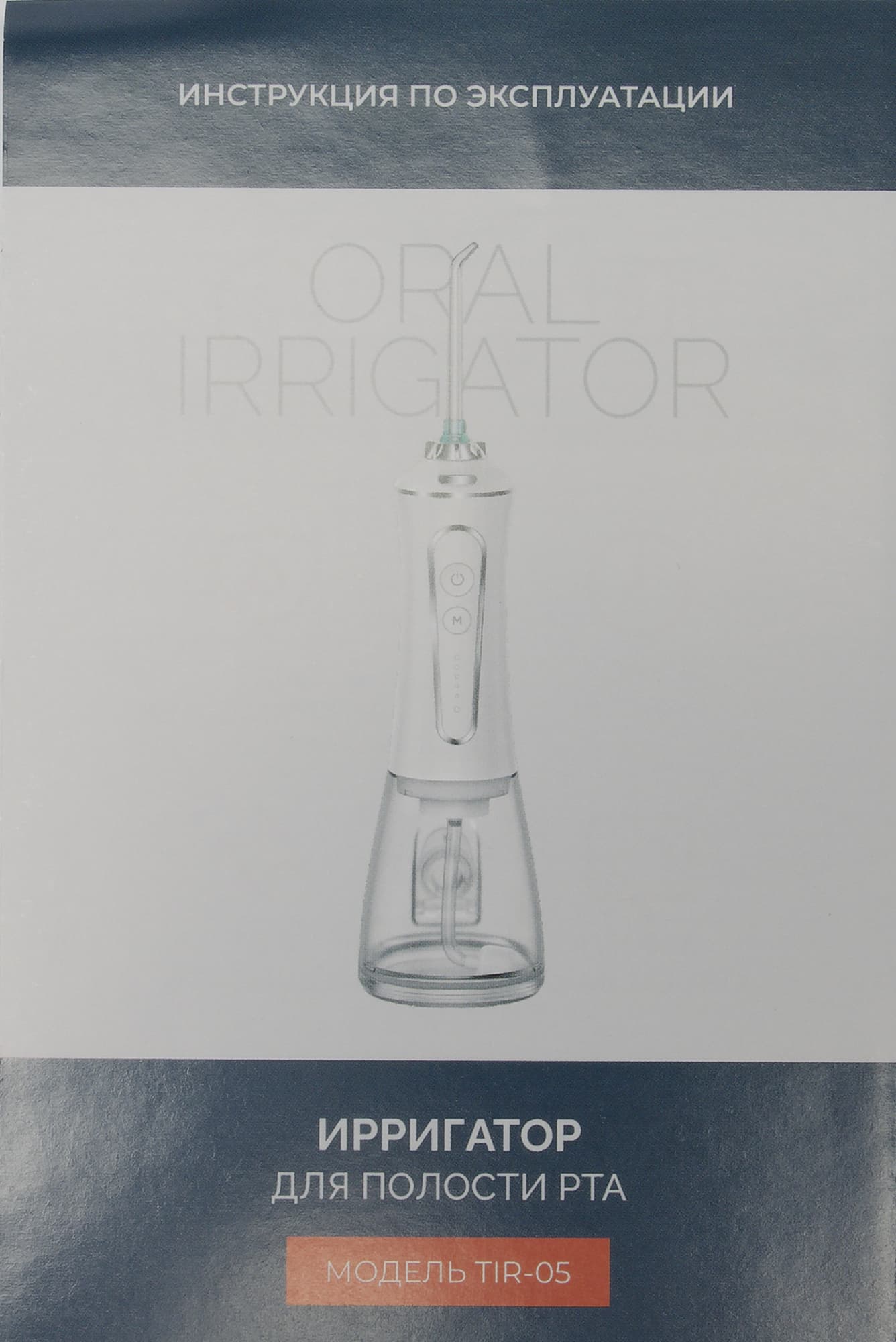 Ключевой документ в этом случае, когда вся информация о приборе доступна только здесь. Перед нами аккуратная, сложенная фальцовкой мини-брошюра в цветах идентичных коробке на русском языке. На обложке указан формат буклета «инструкция по эксплуатации», спецификация прибора (ирригатор для полости рта) и номер модели.