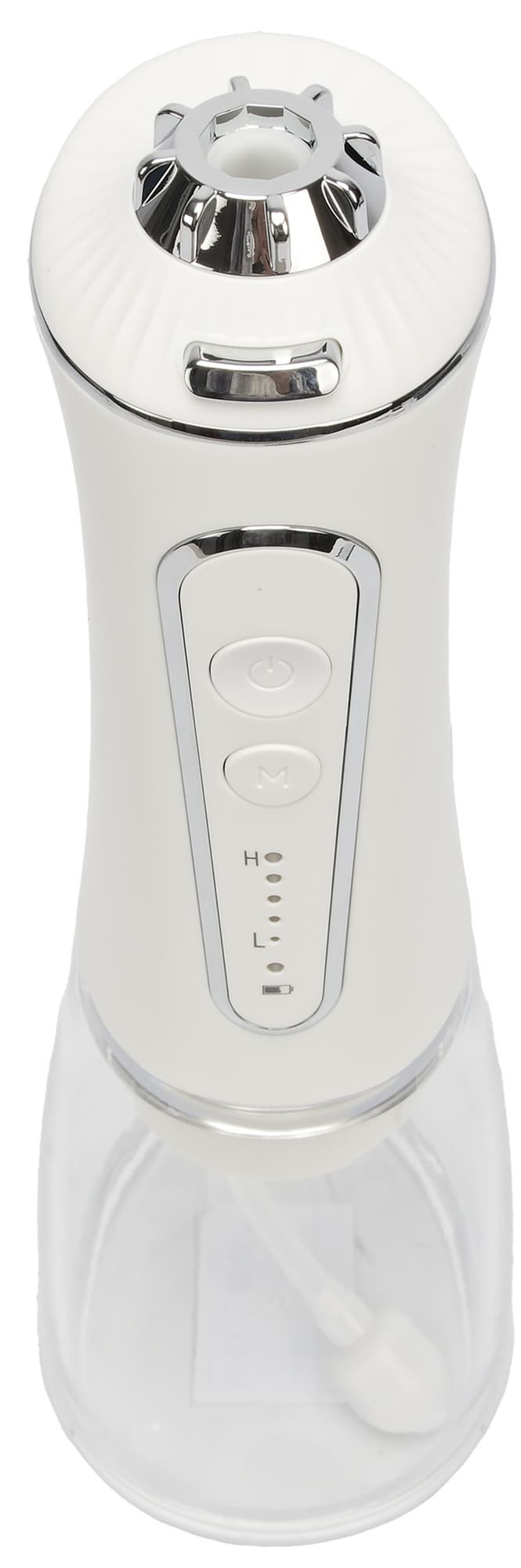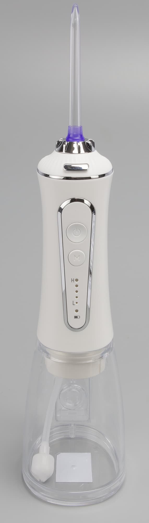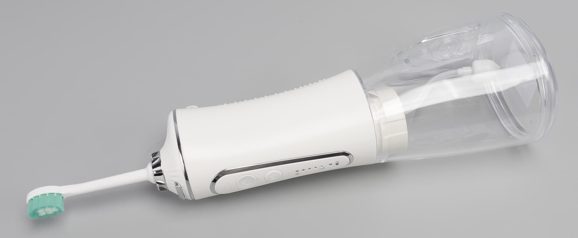 Сам прибор выглядит довольно привычно, выполнен из внешне приятной пластмассы: нижняя часть (бак для воды) из прозрачной, верхняя часть — самого прибора с батареей — белого цвета. У панели управления и место крепления насадок подчеркнуты деталями в серебристом цвете.