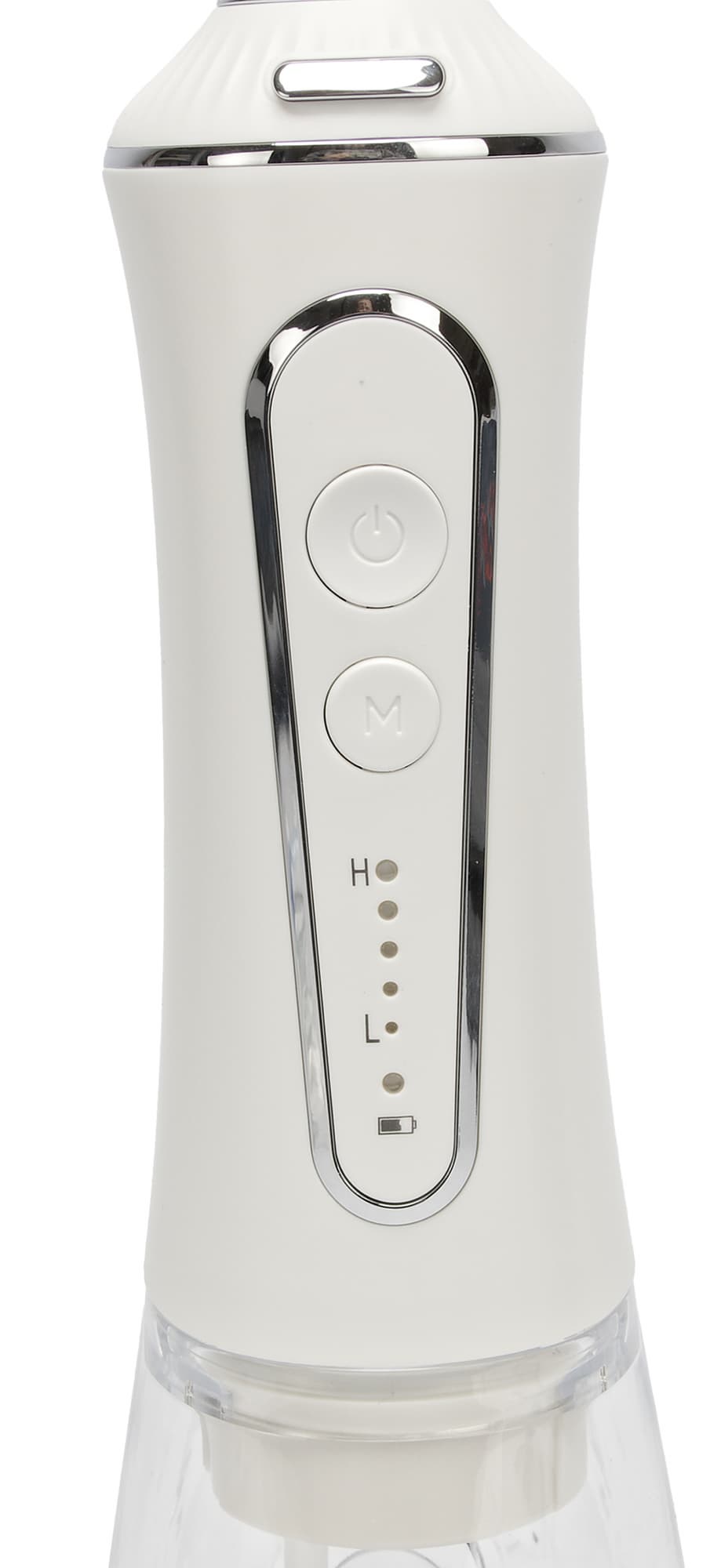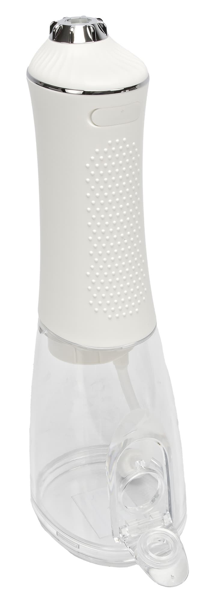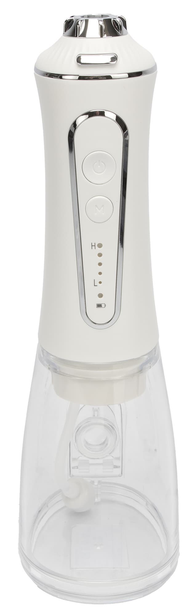 Сам прибор выглядит довольно привычно, выполнен из внешне приятной пластмассы: нижняя часть (бак для воды) из прозрачной, верхняя часть — самого прибора с батареей — белого цвета. У панели управления и место крепления насадок подчеркнуты деталями в серебристом цвете.