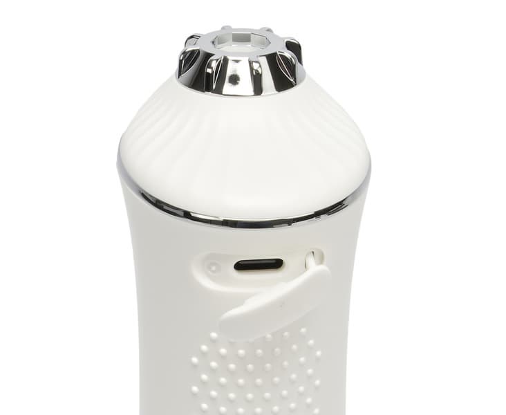 Место для крепления зарядки тоже выбрано вполне традиционно — на спине прибора, сверху закрыто белой резиновой заглушкой. Легко обнаруживается, закрывается и открывается. Ровно под ним начинается шершавая площадь для захвата рукой. Заряжается прибор через шнур USB-С, производитель обещал полную зарядку за 3 часа. Индикатор уровня заряда во время зарядки мигал красным, заряженный погас.
