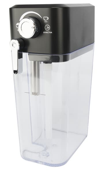 В контейнере для молока есть сопло парового шланга для выхода вспененного молока и пластиковая трубка для забора молока. Регулятор металлического сопла при повороте направляет молочную пену в чашку, есть регулятор пены: для капучино, латте и режим очистки. Резервуар с остатками молока можно хранить в холодильнике. В комплекте два стандартных металлических фильтра с «улучшайзерами» для взбивания кофейной пенки и пластиковый темпер.