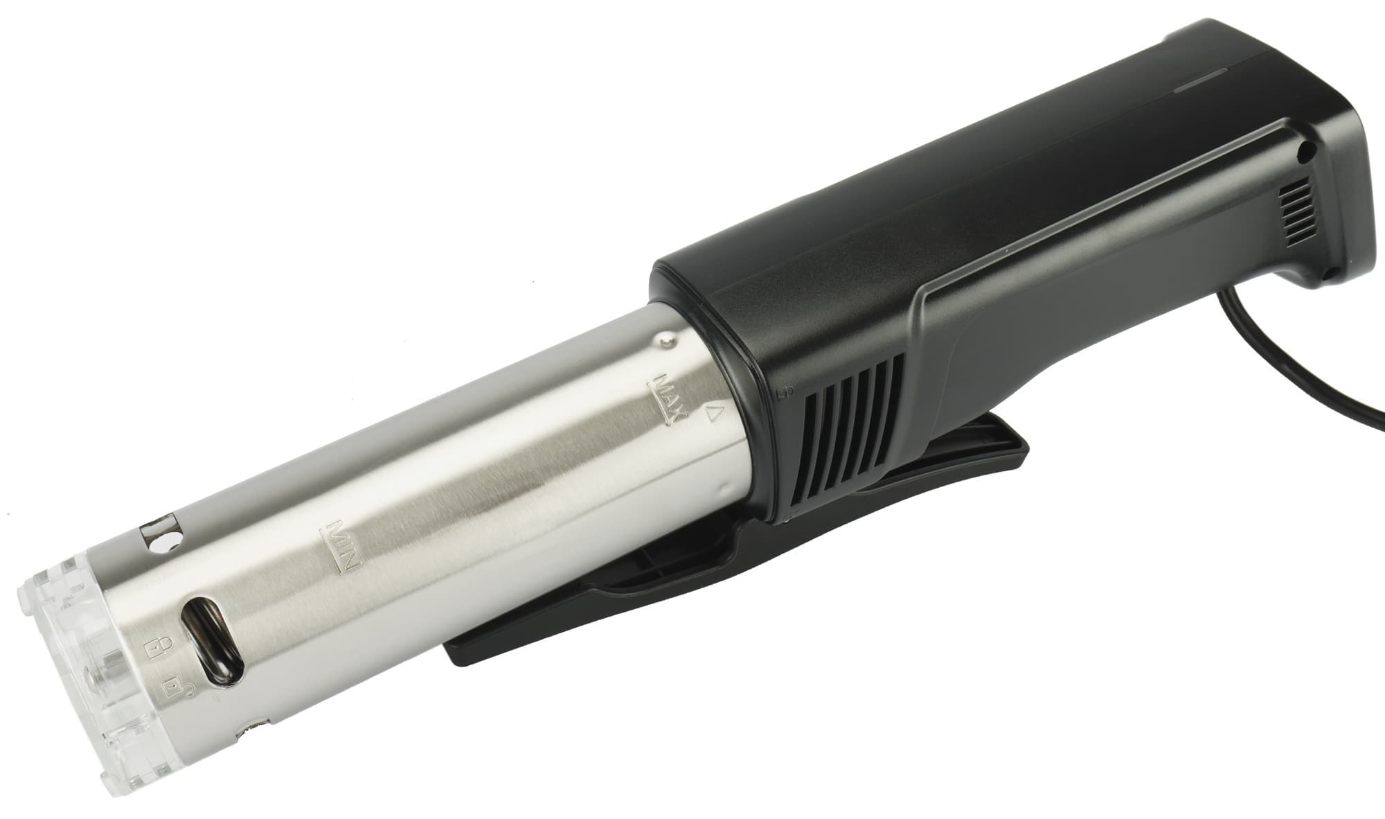Если вы привыкли готовить дома по технологии су-вид, но тащить большой прибор на дачу нет желания, для загородной жизни можно приобрести погружной компактный термостат. Забегая вперед, скажем, что у этой модели нет автоотключения — только звуковые сигналы об окончании времени приготовления. Но в остальном недорогой прибор превзошел наши ожидания и обеспечил нам вкуснейшее диетическое меню на неделю.
