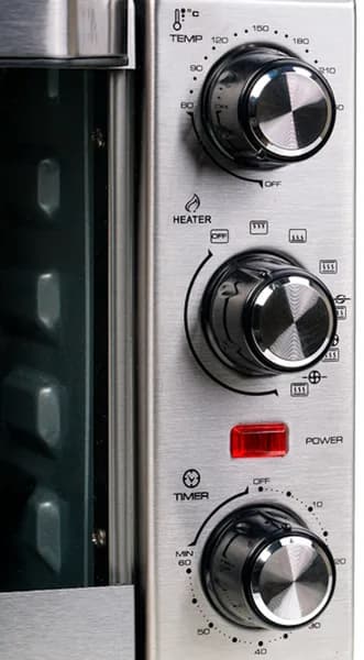 Управление печью — электромеханическое, при помощи поворотных переключателей. Верхний устанавливает температуру работы от 60 до 250 °C с шагом в 10 °C; средним выбирается комбинация режимов нагрева (работы тэнов, конвекции, вертела). Нижний регулятор — это таймер, устанавливающий продолжительность работы от 5 до 60 минут с шагом в одну минуту.