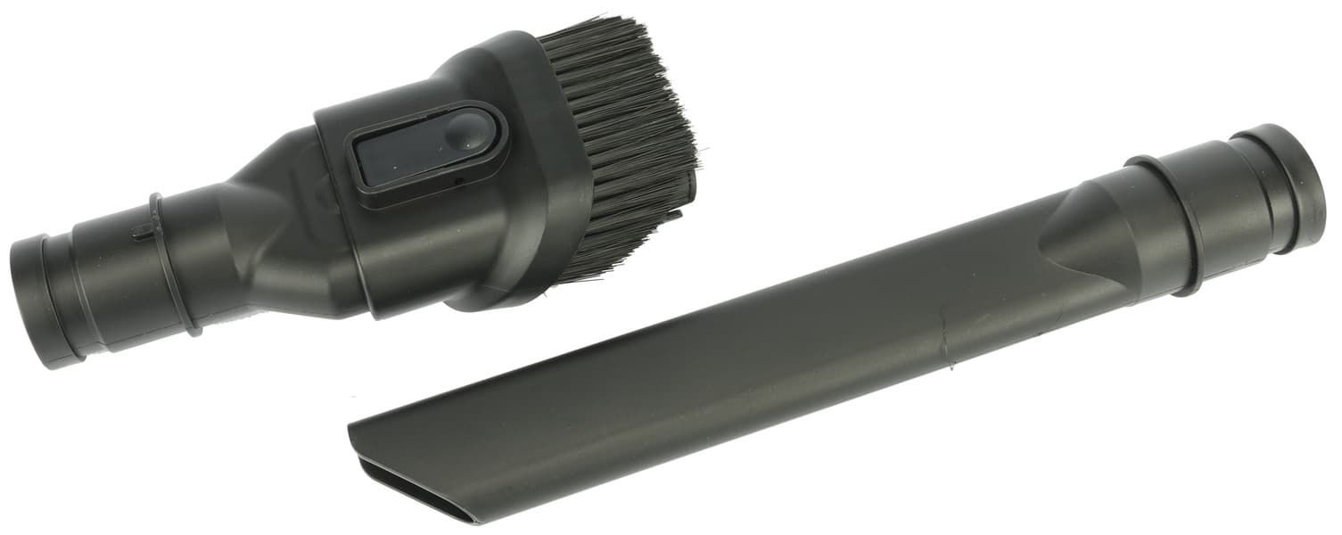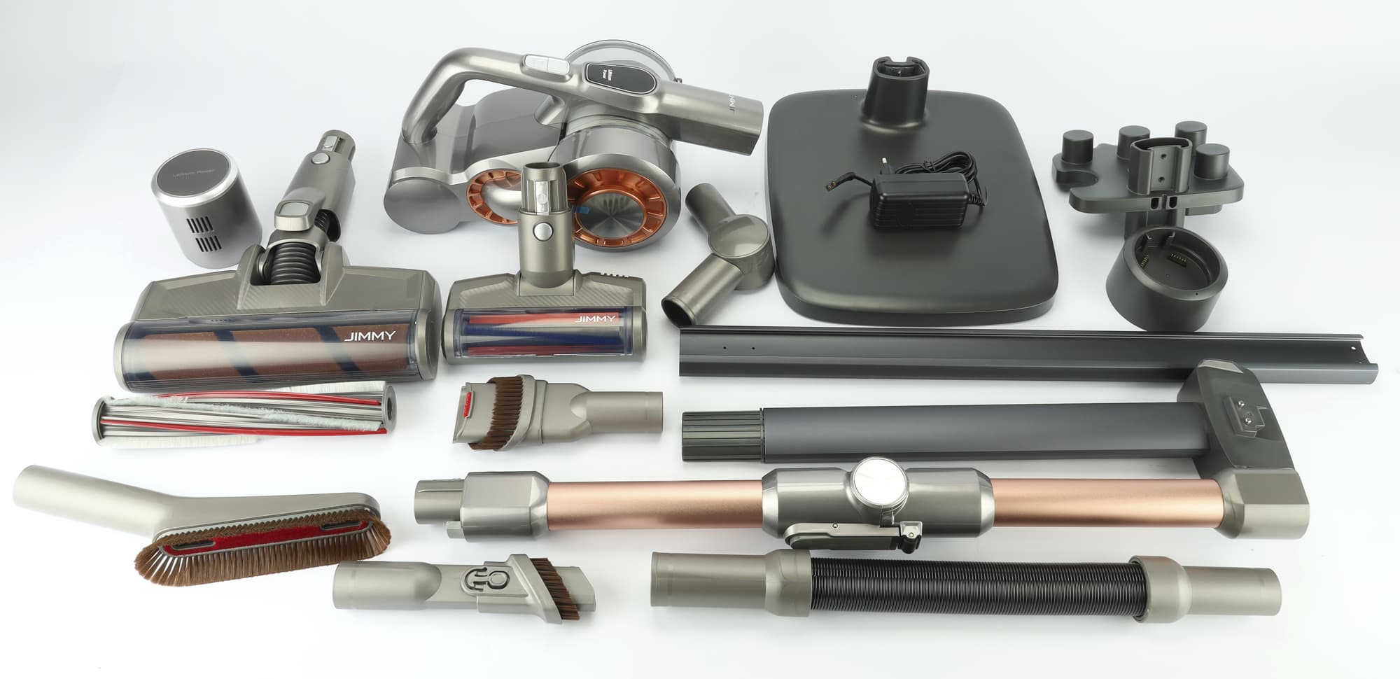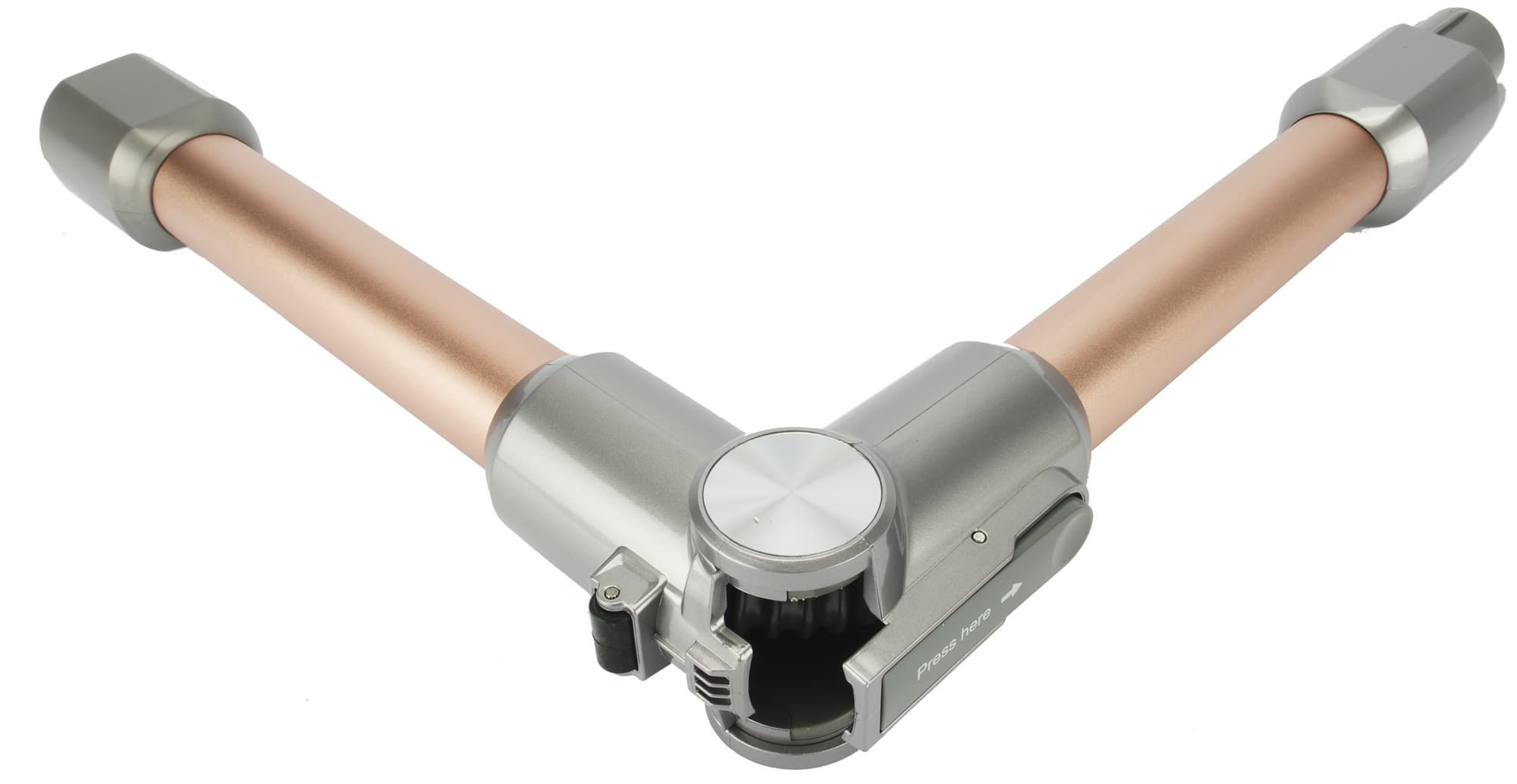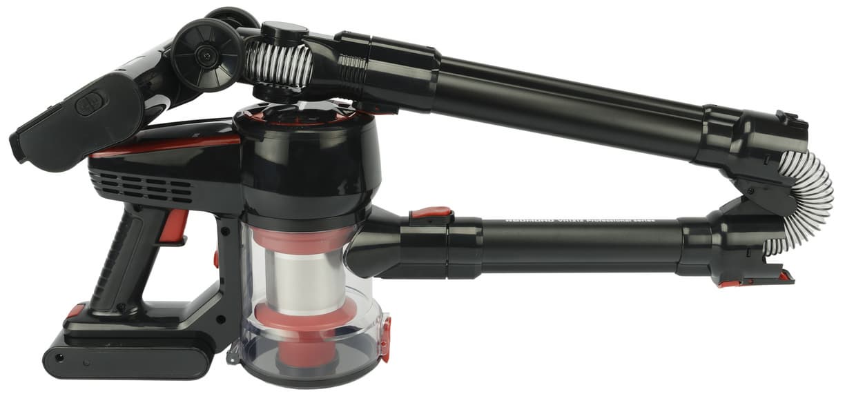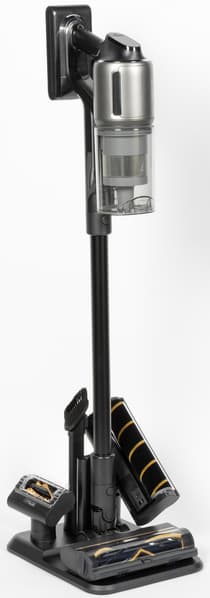В основной моторизованной насадке предусмотрены два сменных ротора: мягкий для твердых поверхностей, жесткий — для ковров. Остальные насадки обычные: щелевая, для мягкой мебели. Трубка имеет шарнир и складывается почти пополам. В комплект входит стойка для хранения пылесоса и насадок (не для зарядки). Зарядное устройство подключается к моторному блоку отдельно. Заряжать аккумулятор можно на пылесосе и отдельно: он съемный.