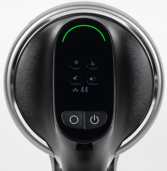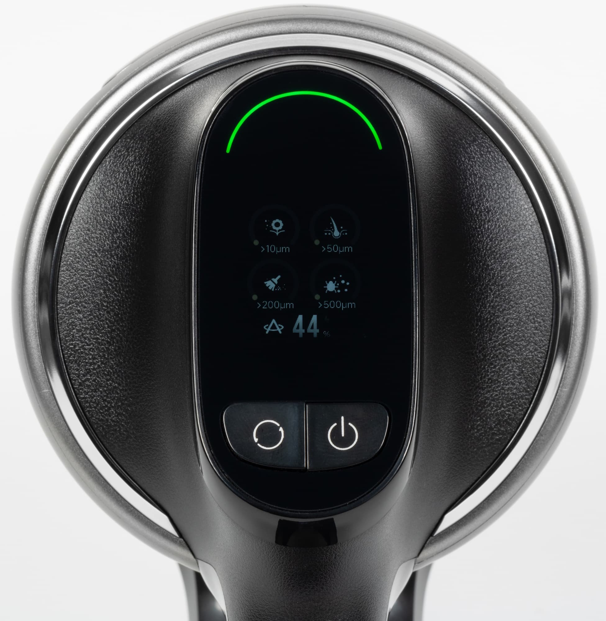 А еще это умная модель с настоящим авторежимом уборки: если пылесос при помощи датчиков определяет в потоке воздуха много мусора или крупных частиц, он повышает мощность. Если загрязнение обычное — работает в стандартном режиме. Цветовой индикатор уровня загрязнения показывает, сколько мусора собирает пылесос в данный момент. Также есть индикация уровня заряда и напоминание о необходимости очистки НЕРА-фильтра.