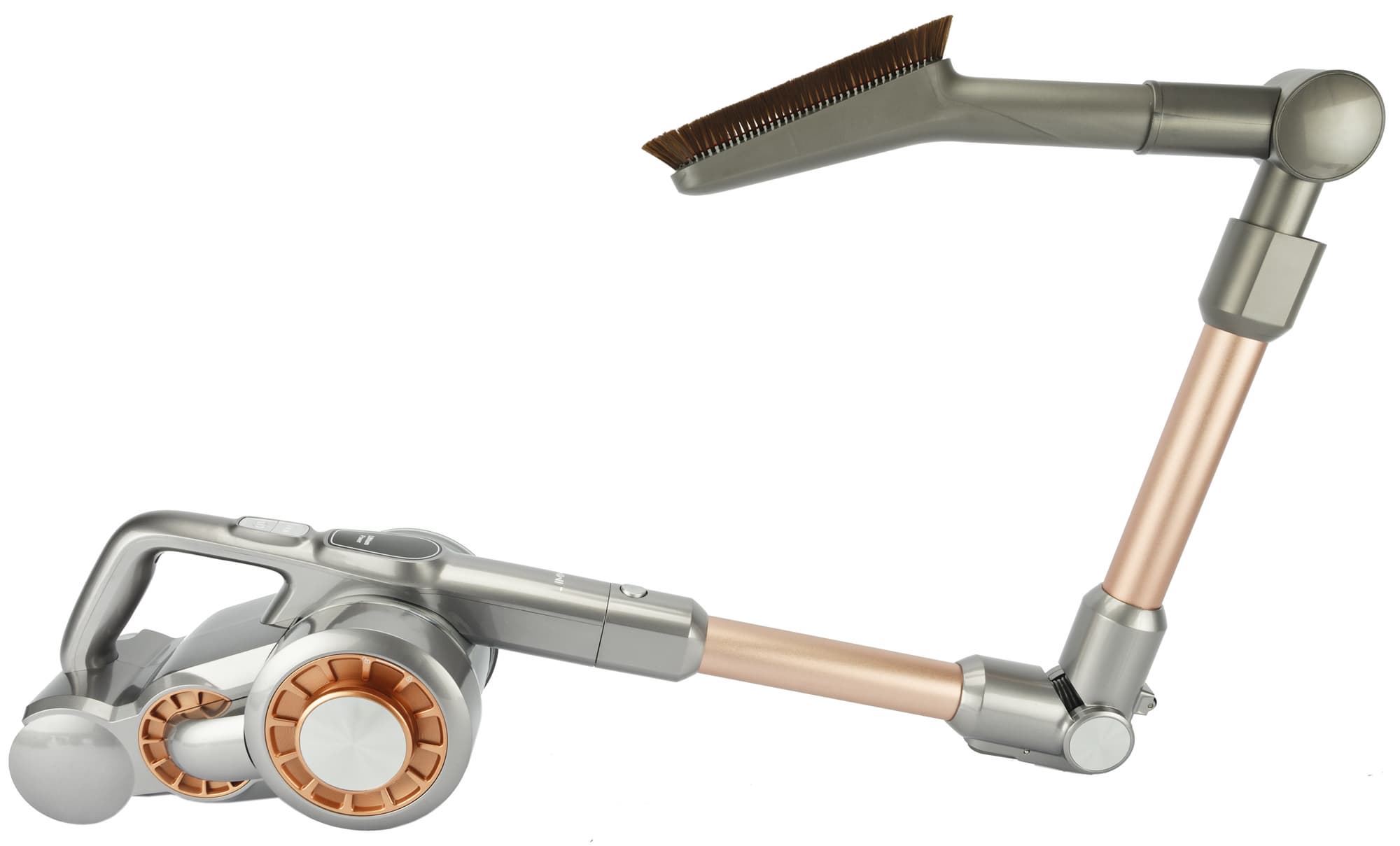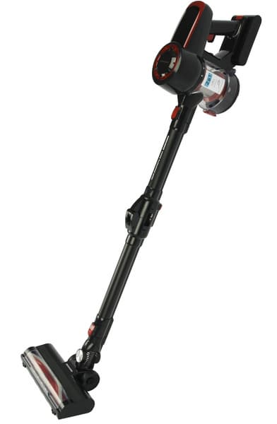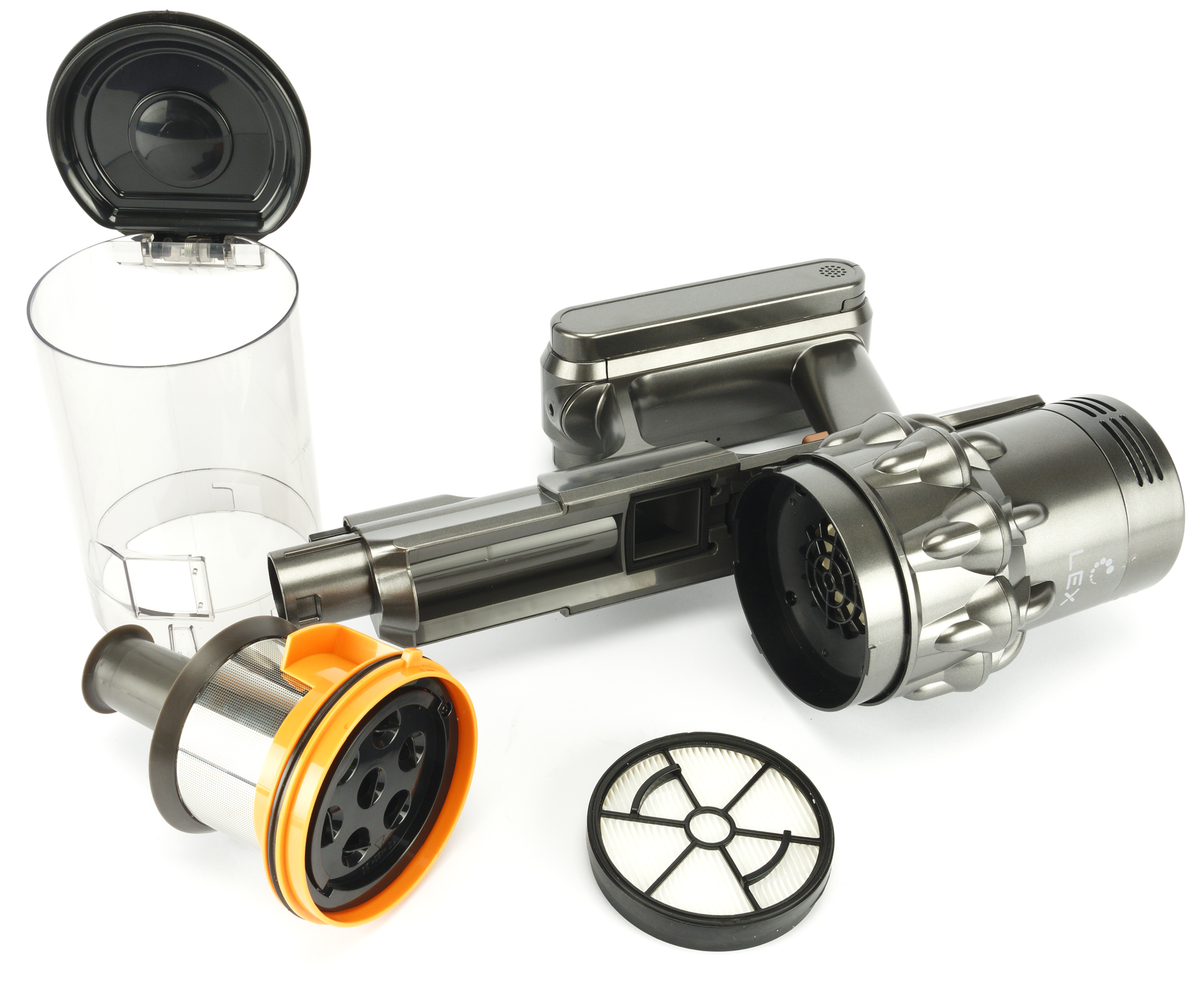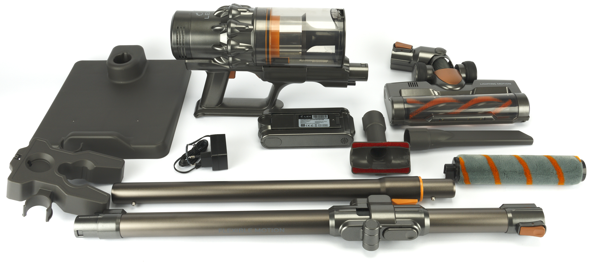 Пылесос с инверторным бесщеточным (BLDC) мотором с потребляемой мощностью 450 Вт и с жидкокристаллическим индикатором зарядки и скорости работы выполнен по продольной схеме: контейнер-циклон установлен параллельно воздушному тракту. Это значит, что поток воздуха с мусором и пылью перед попаданием в контейнер разворачивается на 180°. По этой причине в пылесосах такой конструкции крупный мусор может застревать на входе в пылесборник.