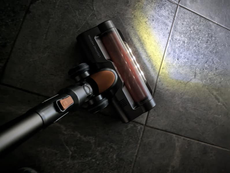 У модели три скорости работы. Переключать их во время работы с пылесосом той же рукой, что держит прибор, не получится: надо остановиться и задействовать вторую руку. Во всем остальном модель удобна: легкая, маневренная, хорошо сбалансированная: в основной конфигурации (моторный блок, аккумулятор, удлинительная трубка и насадка для пола) пылесос весит 2855 г. В конфигурации для ручной уборки вес модели всего 1780 г. Конструкция позволяет убирать в труднодоступных местах на всю длину трубки. Подсветка рабочей зоны помогает не пропустить ни соринки.
