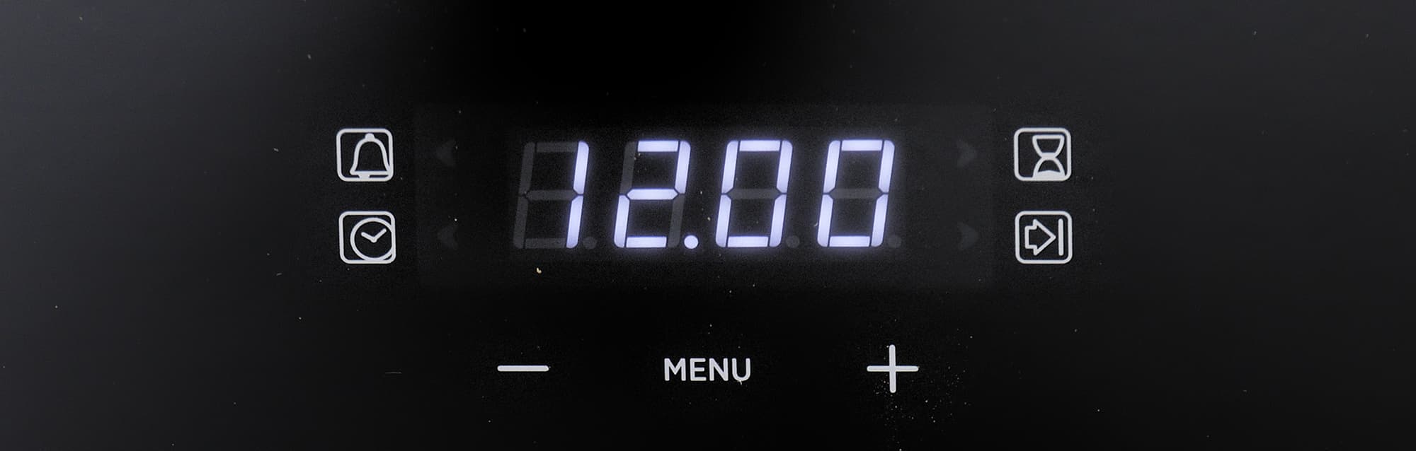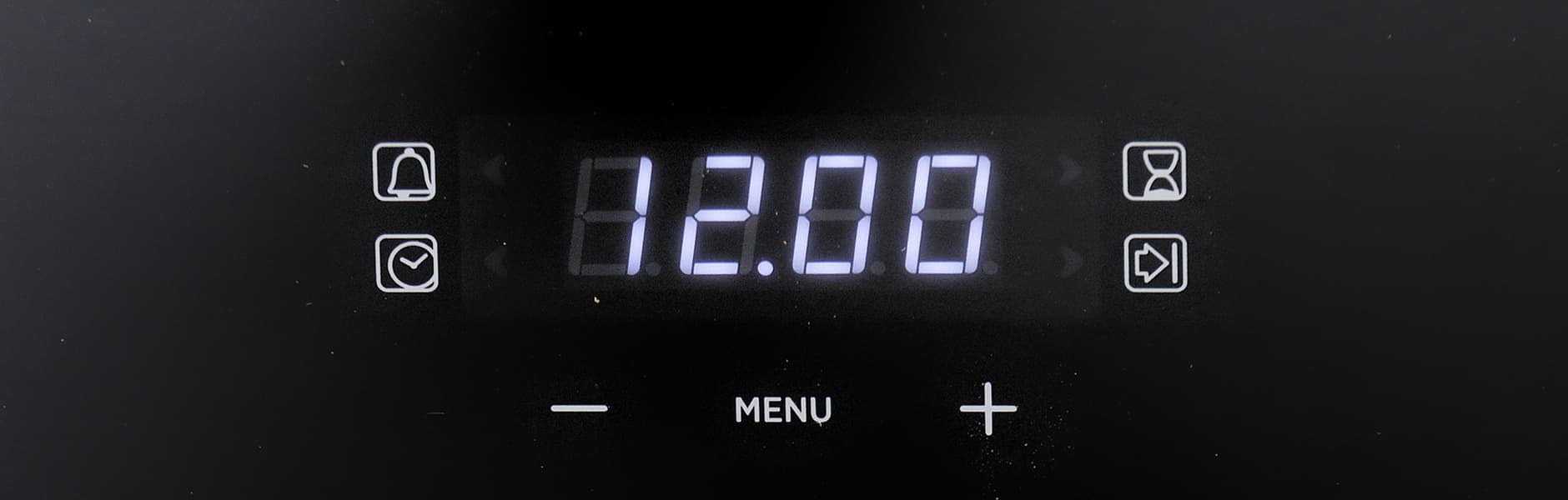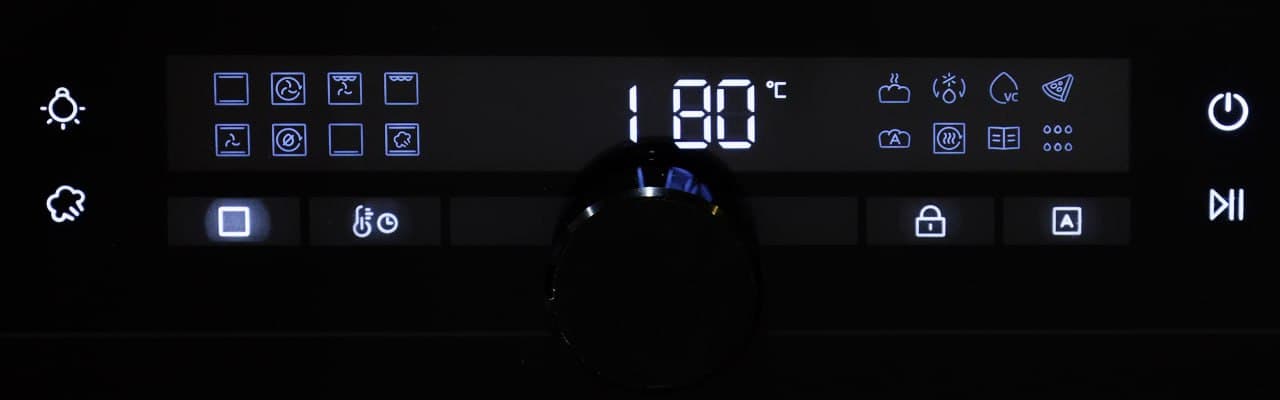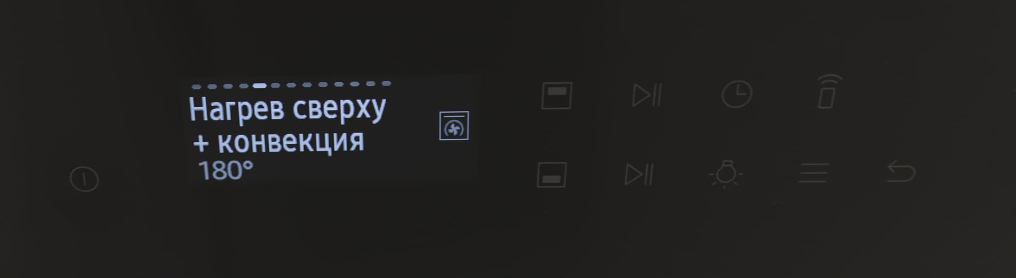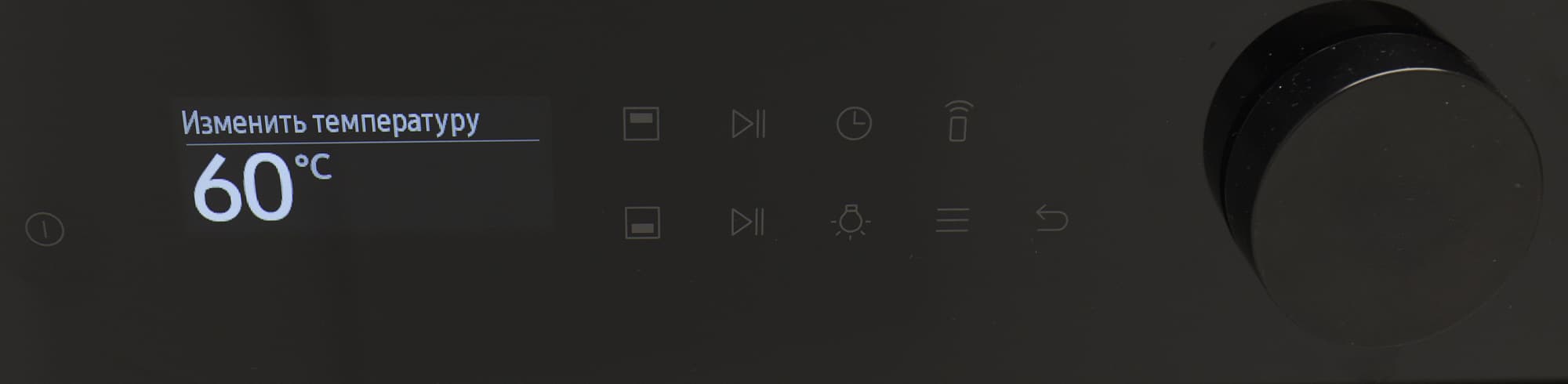 Управление духовкой — сенсорное: никаких аналоговых переключателей, только сенсорные кнопки и дисплей. Он отображает выбранный режим и текущую температуру внутри духовки (вот тут наши измерения показали некоторые неточности, к сожалению).