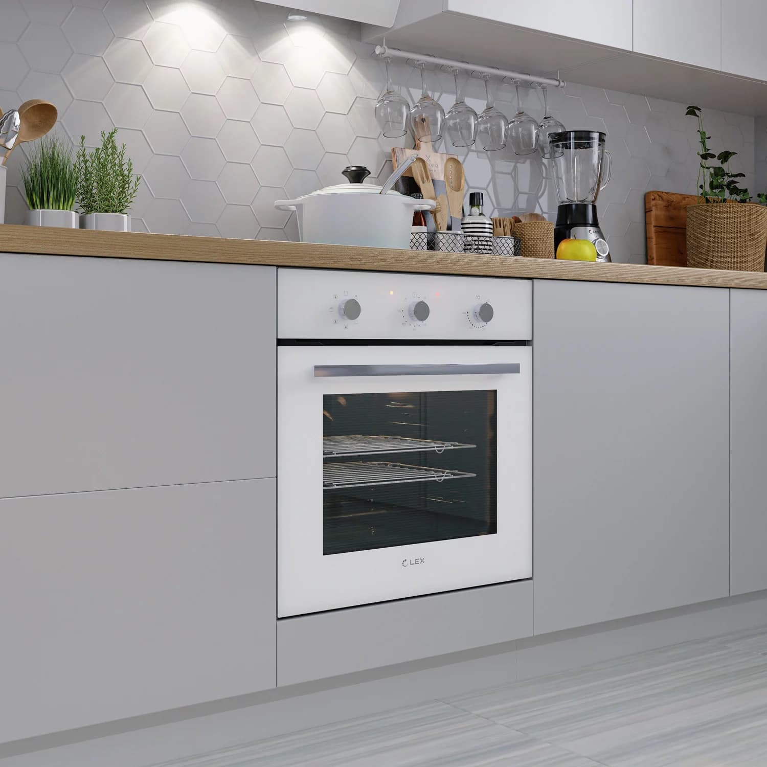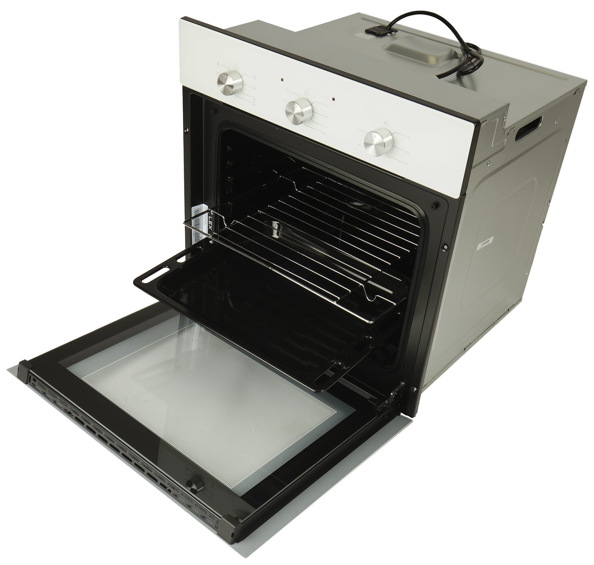 Бюджетная модель из коллекции White сочетается по стилю с такими же белыми варочной панелью, вытяжкой, встраиваемой микроволновкой, раковиной и смесителем, имеет 36,6 месяцев гарантии (и нет, это не температура), в течение которых производитель обещает замену техники в случае невозможности быстрого ремонта на месте. Духовка объемом 60 литров имеет механическое управление (3 поворотных неутапливаемых переключателя, в том числе таймер), несколько режимов нагрева (верхний тэн, нижний тэн, верхний+конвекция, верхний+нижний, размораживание) и диапазон температур от 50 до 250 градусов, что позволяет использовать этот духовой шкаф не только для запекания, но и для томления, сушки, приготовления меренг. Дверца духовки съемная, оснащенная двойным стеклом, внутреннее — вынимается. Важно: дверца не падает при открывании, а фиксируется в любом положении. Чтобы мебель возле духового шкафа не сильно нагревалась, а сам он лучше держал тепло, используется тангенциальное охлаждение по контурам.
