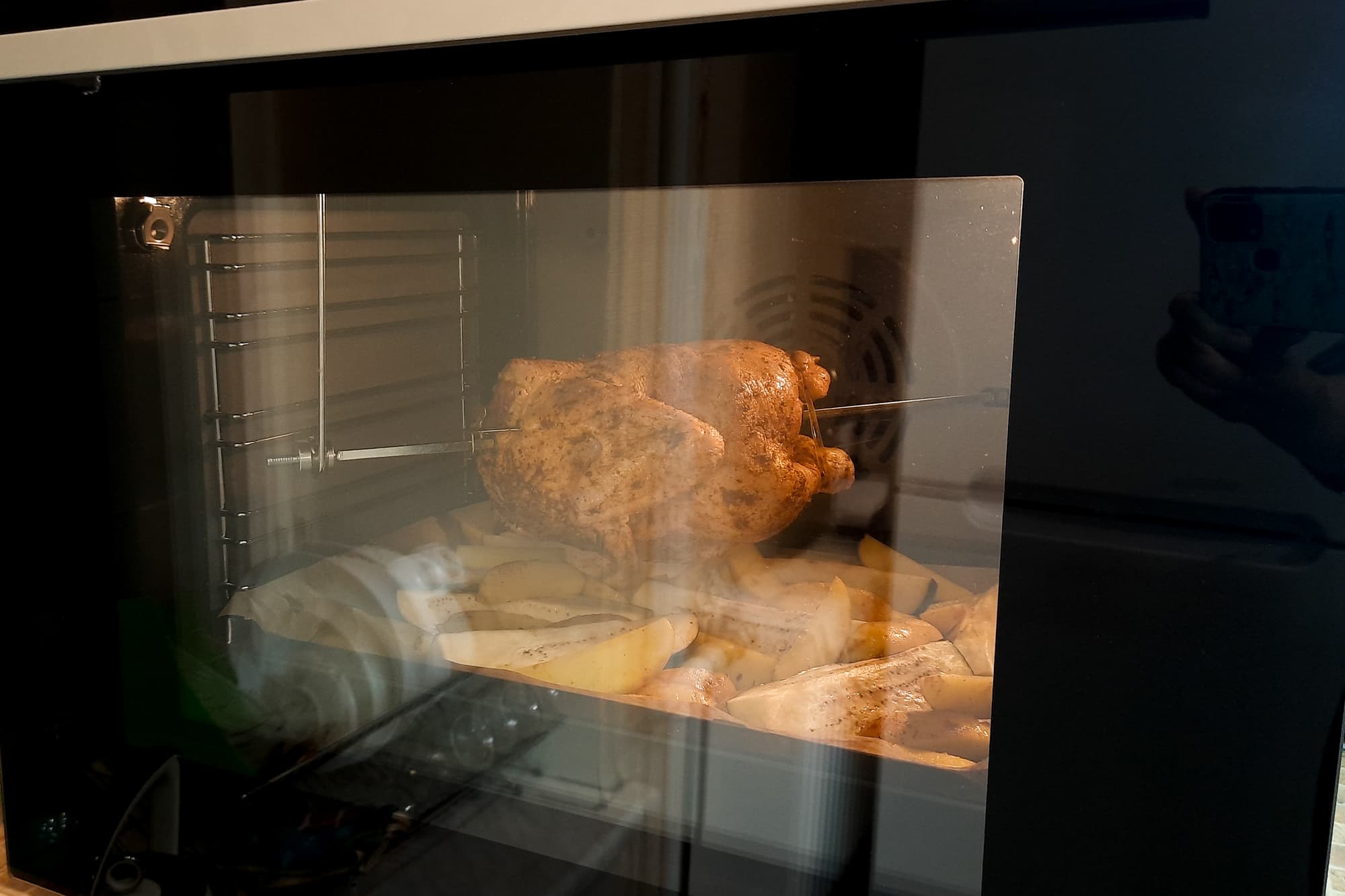 Среди режимов мы особенно отметили турбо-гриль + вертел: готовили на вертеле целую курицу, а на нижний уровень установили противень с овощами — получилось просто шикарно. Кроме того, мы запекли филе индейки с использованием термощупа — это удобно и позволяет не пересушить мясо и получить нежное, но хорошо пропеченное блюдо. Нам также понравилось наличие режимов для пиццы, разморозки, приготовления блюд с корочкой с минимум масла. Вентилятор конвекции используется сразу в нескольких режимах.