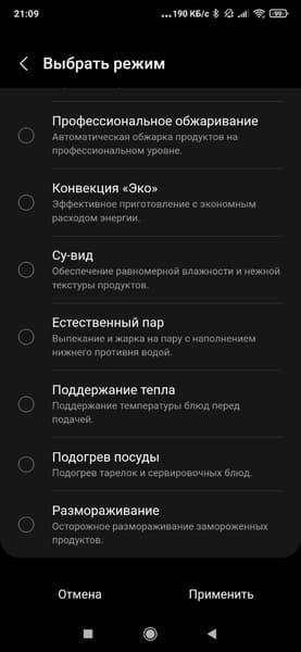 Еще одна заинтересовавшая нас особенность — наличие режима для приготовления блюд по технологии су-вид — Air Sous Vide. Температуру в этом режиме можно выставить с точностью до одного градуса, а приготовление, как видно из названия программы, происходит при помощи горячего воздуха, а не в воде, как в традиционном су-виде.