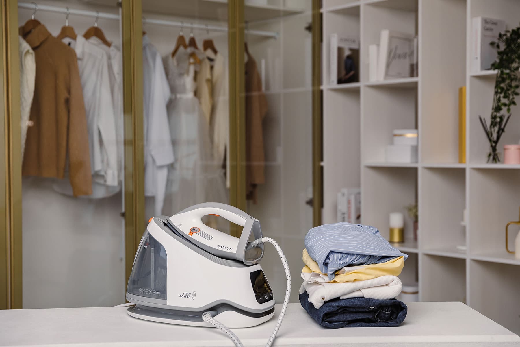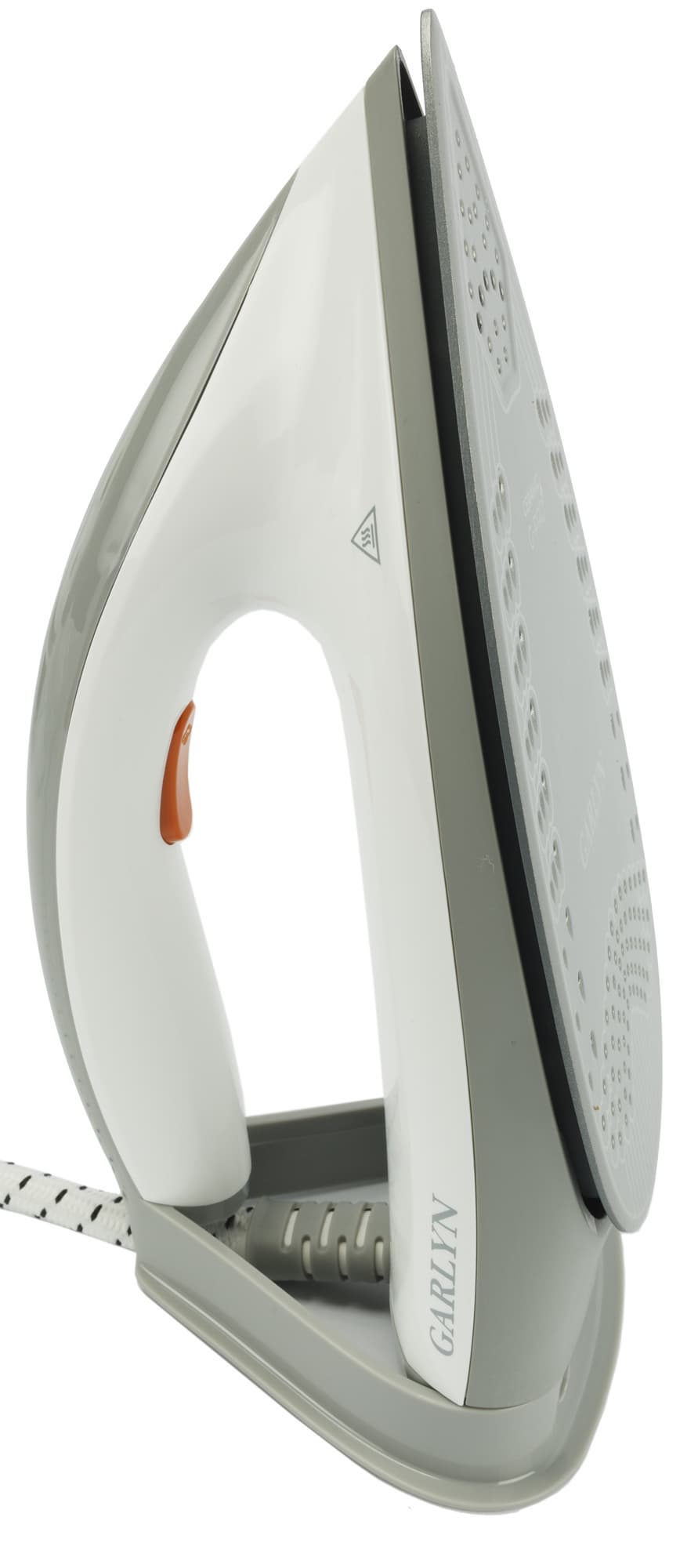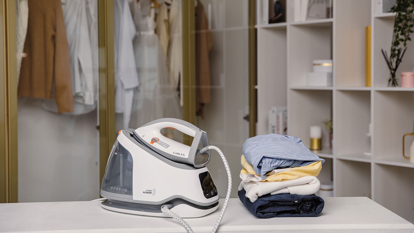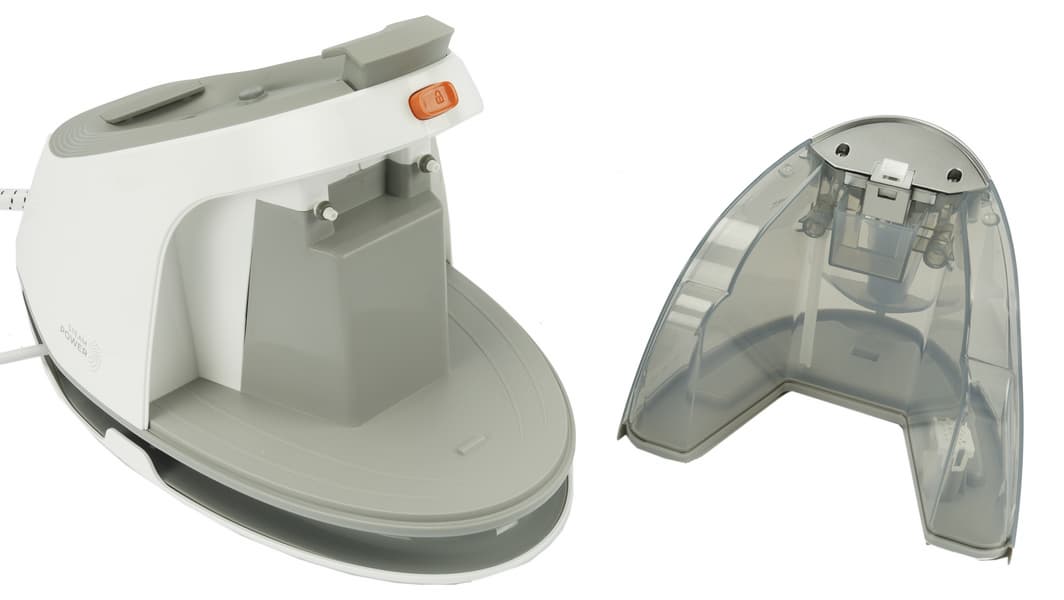 Garlyn GST-08 Pro оказался качественно изготовленным прибором с безупречно обработанными поверхностями и подогнанными стыками. Паровой шланг и кабель имеют достаточную длину и удобно наматываются на корпус, закрепляясь в пазах на нем. Дисплей с индикаторами, кнопки включения и выбора интенсивности пара (плюс и минус) находятся в привычных и удобных местах, управление простое и понятное. Паровой удар происходит при быстром двойном нажатии на кнопку подачи пара под ручкой утюга. Фиксаторы утюга на базе обозначены оранжевым цветом.