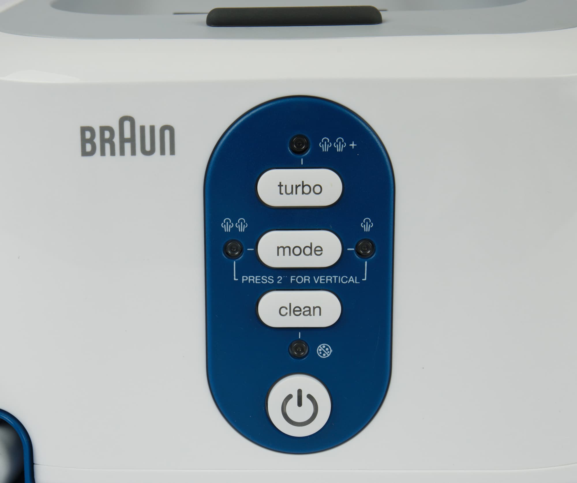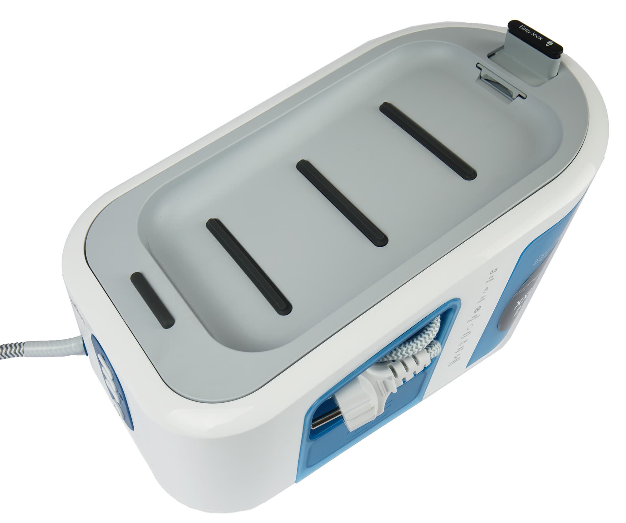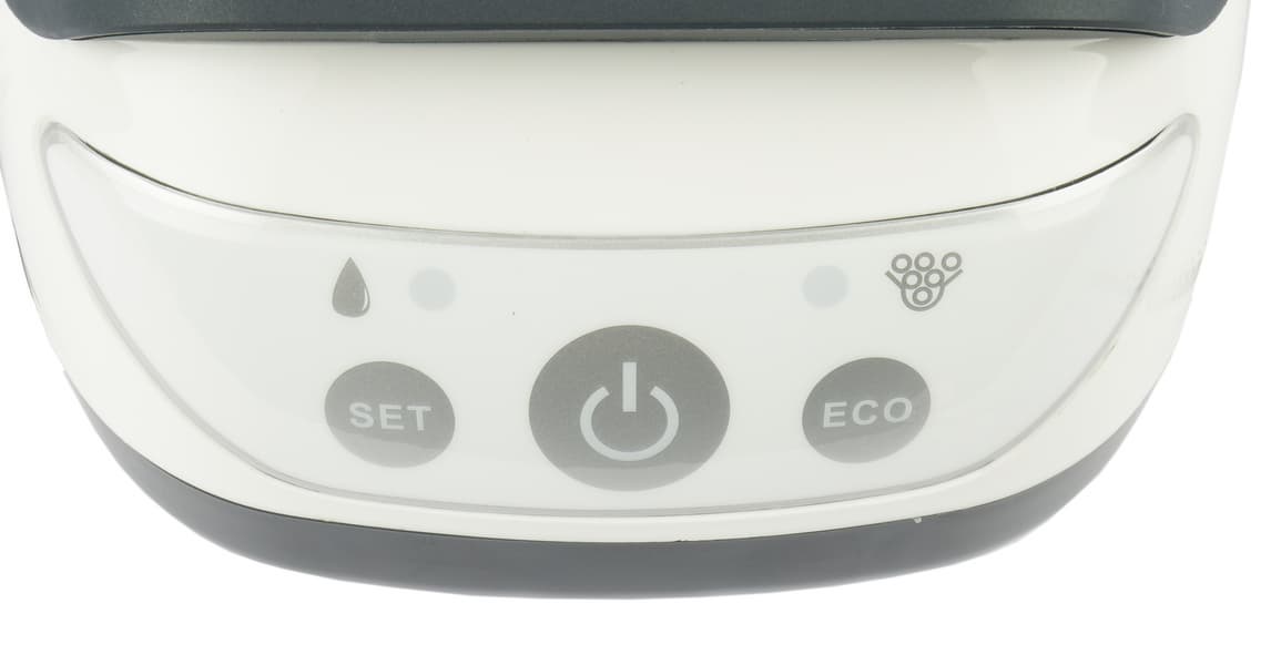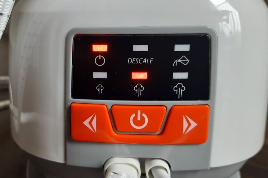 Англоязычная панель управления находится сбоку базы, клавиша подачи пара расположена стандартно: на ручке утюга с внутренней стороны. Есть кнопка «turbo»: при ее нажатии парогенератор работает на максимуме. Паровой удар в этом приборе — это пульсирующая струя пара максимальной мощности. При бездействии в течение 10 минут прибор автоматически отключается, помигав на прощание индикаторами.