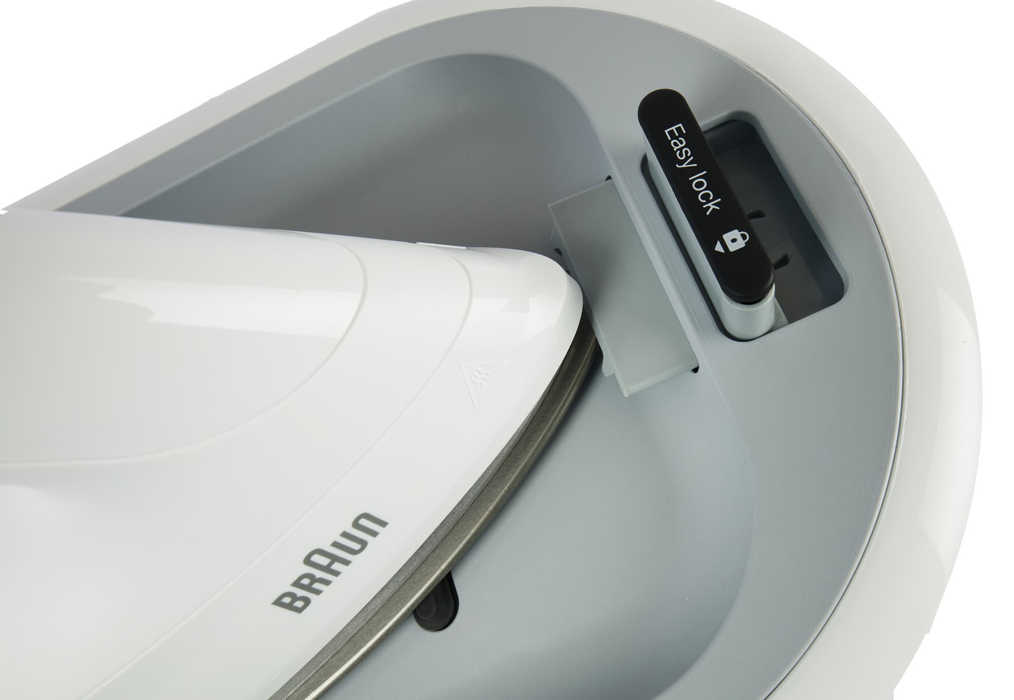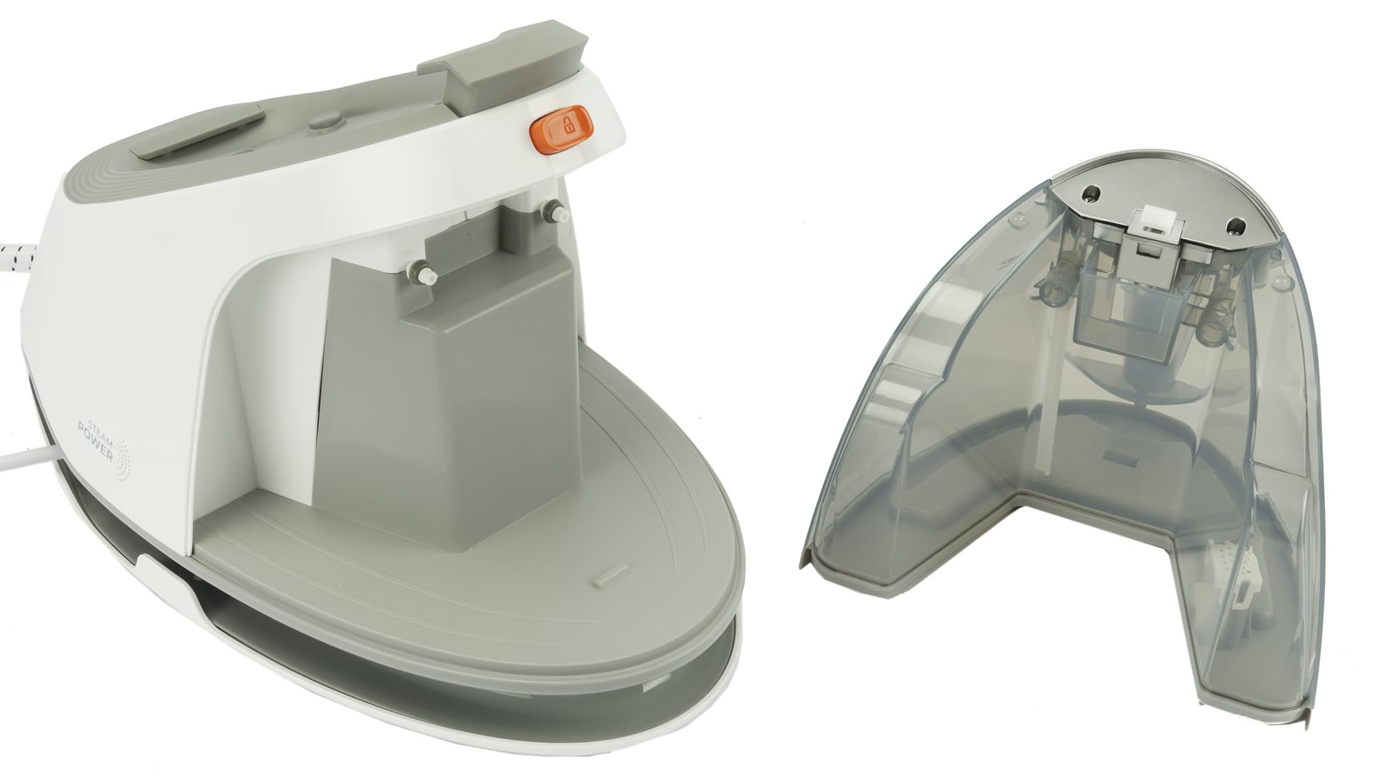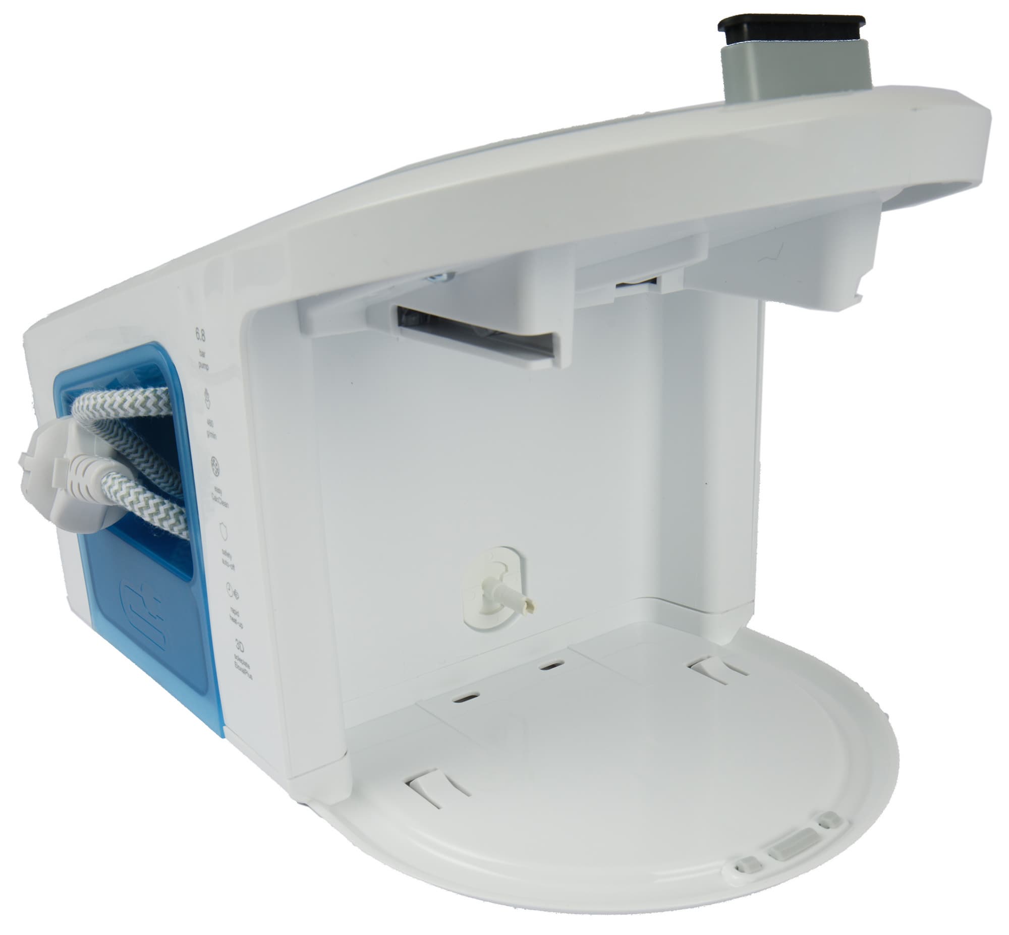 Еще одна особенность — съемный резервуар в форме подошвы утюга для ее очистки. Туда стекает вода после запуска программы очистки от накипи, клавишей «clean». Схема действий нанесена прямо на это приспособление, поэтому у пользователя не будет затруднений при очистке: утюг устанавливается в резервуар, запускается программа — и дело в шляпе. То есть в резервуаре.