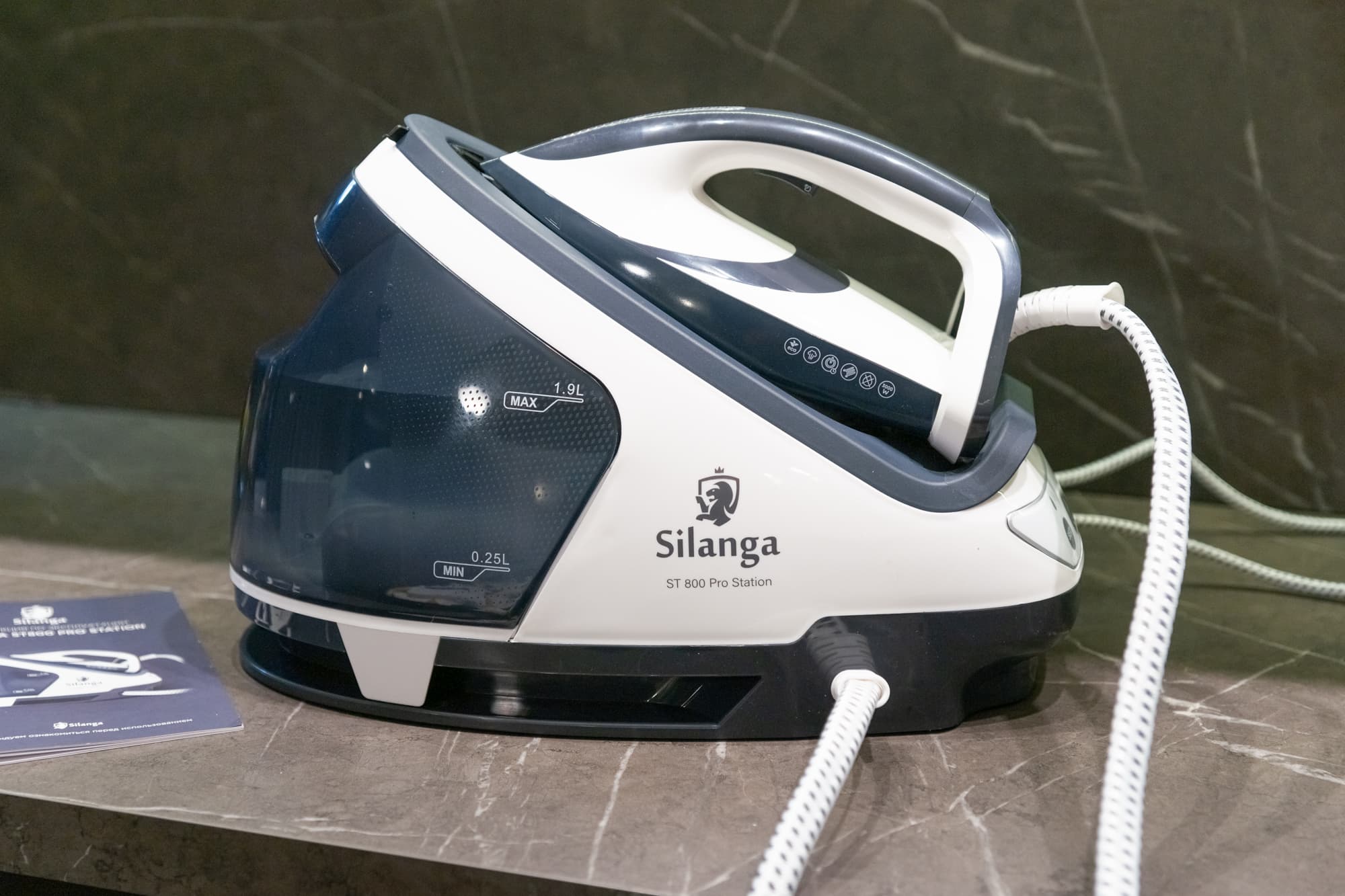 Один из самых мощных (кстати, показания ваттметра практически совпали с данными технической документации), стильных и удобных парогенераторов, побывавших в нашей лаборатории. Отличное качество сборки, простое понятное управление, большой резервуар для воды — все сделано по уму. Модель работает в минимальном и максимальном режимах, к каждому из которых можно добавить опцию «эко» для уменьшения потребления электричества при сохранении эффективности работы. Возможно сухое глажение, с паром и вертикальное отпаривание. Индикатор нехватки воды сообщает о необходимости долива, индикатор необходимости очистки от накипи — соответственно, об этой процедуре, хотя производитель рекомендует заливать в резервуар дистиллированную воду. Через 10 минут бездействия в любом режиме парогенератор автоматически отключается.