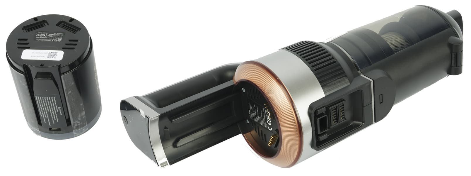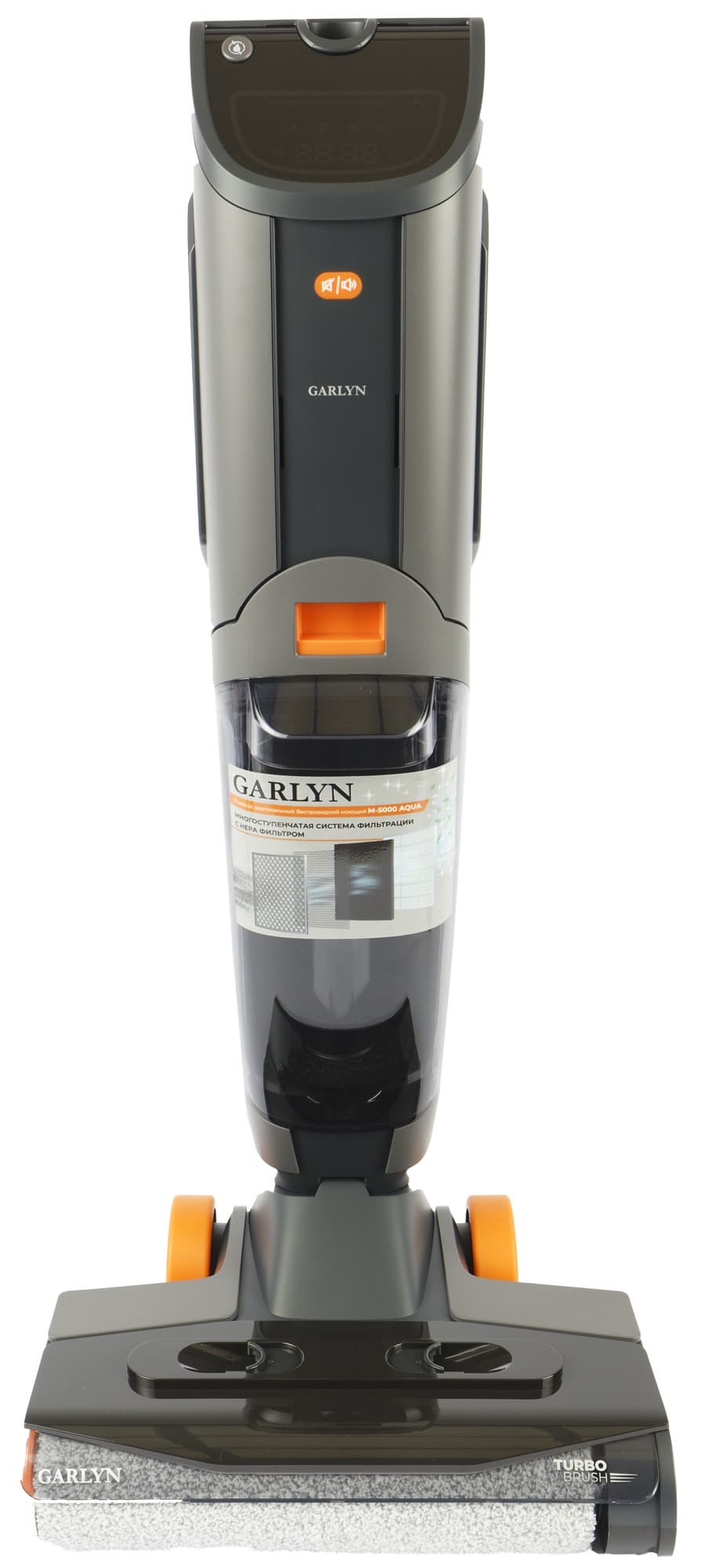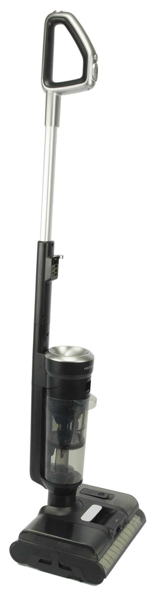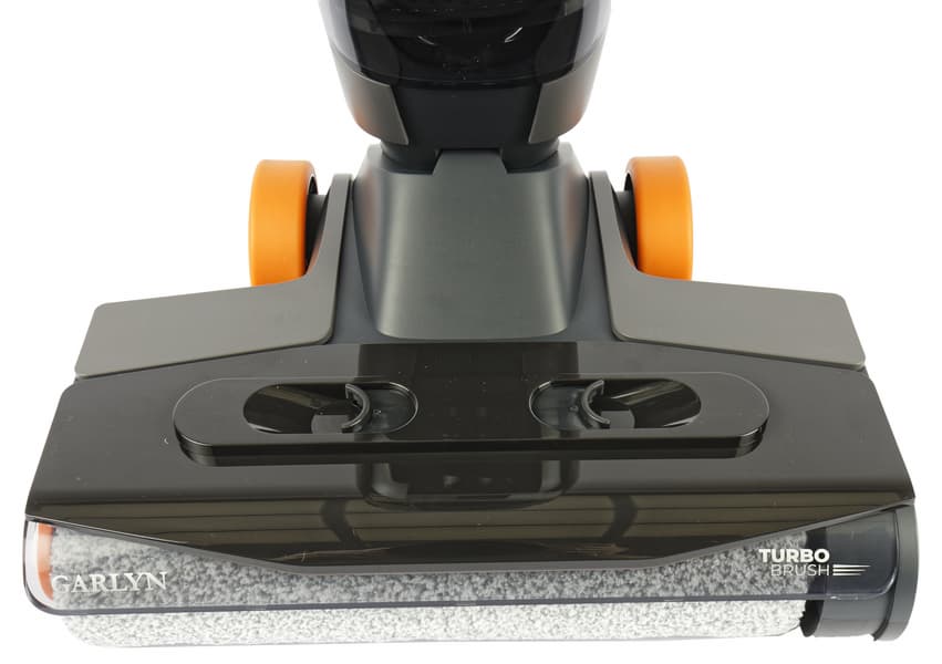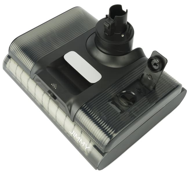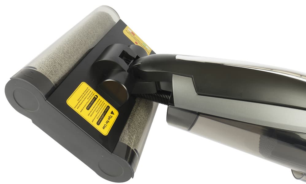 В верхней части корпуса расположен моторный блок с несъемным аккумулятором и дисплеем. Спереди к моторному блоку крепится резервуар для грязной воды с системой фильтрации, а бак для чистой расположен сзади. Вода подается на пол и засасывается вместе с грязью: воздушная струя с водой и мусором попадает в резервуар для грязной воды через центральную шахту. Вода и сор остаются на дне резервуара, а на выходе из него воздуха установлен HEPA-фильтр.