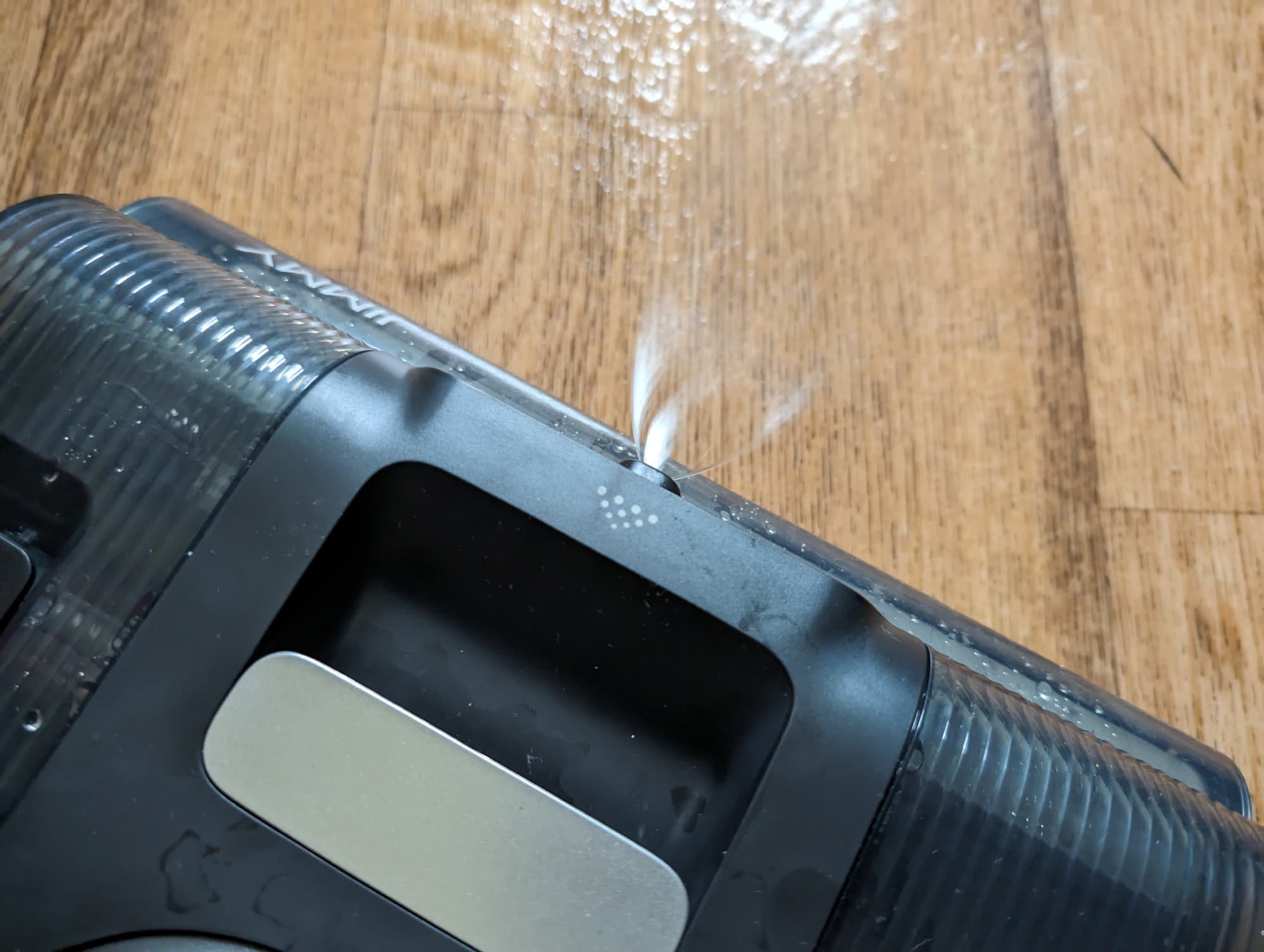 Уровень шума оказался ниже заявленного: 76 дБА в экономичном режиме до 80 дБА в максимальном, что не могло не порадовать. Пылесос может работать без подзарядки около 35 минут в режиме стерилизации и 25 минут в режиме сбора воды, который, как оказалось, работает вовсе не на максимальной мощности. Так, когда мы пытались измерить длительность автономной работы в авторежиме на очень грязном полу пылесос, получили всего 14 минут. То есть пылесос действительно приложил для очистки поверхности максимальные усилия, но быстро разрядил аккумулятор. Впрочем, за это время можно отлично отмыть большую комнату и даже небольшую квартиру.