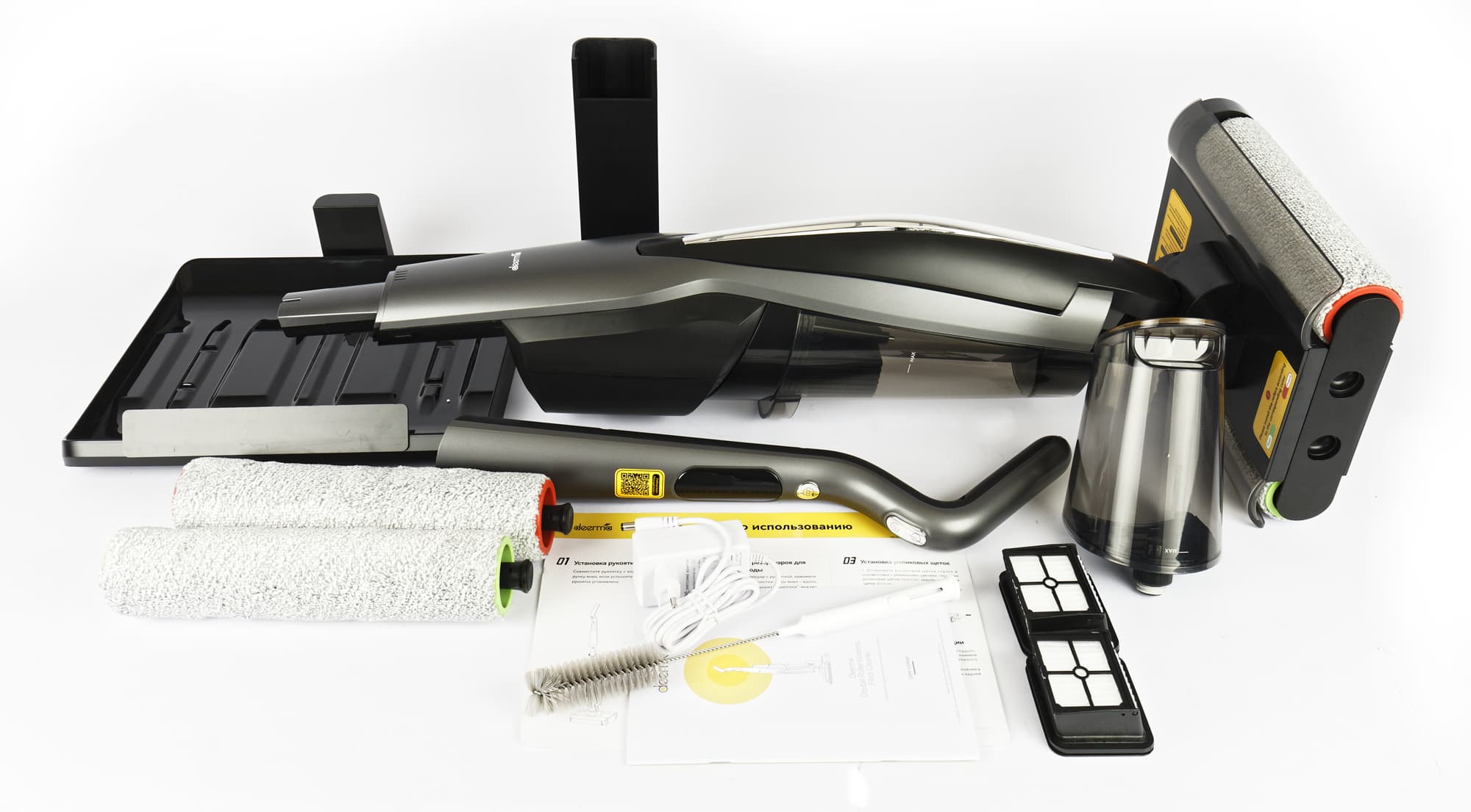 Что пылесос может одновременно собирать мелкий твердый мусор, разлитую жидкость и мыть пол, а также работать просто в режиме сухой уборки. Вода перед использованием стерилизуется в пылесосе двумя способами (электролиз + УФ лампа), это должно избавить ее от примесей и запахов и повысить эффективность влажной уборки. Заряда аккумулятора должно хватать для уборки в просторной однокомнатной или небольшой двухкомнатной квартире. Самоочистка щетки происходит на док-станции, от пользователя требуется вымыть резервуар для использованной воды.