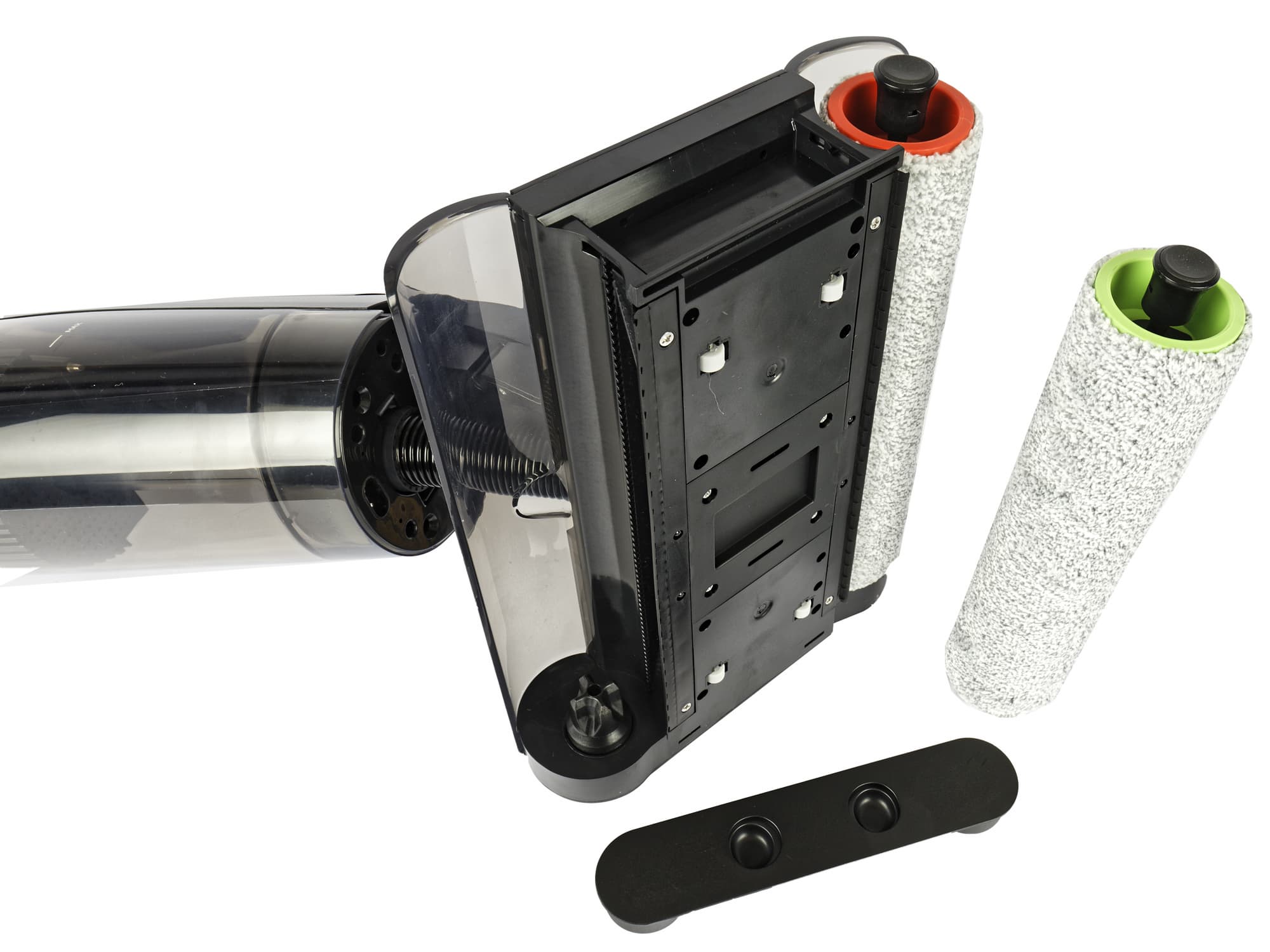 Блок для влажной уборки включает в себя контейнер для грязной воды и влажного мусора с системой фильтрации. В бачке для грязной воды есть перфорированный сепаратор, задерживающий крупные фрагменты мусора, а в нижней части контейнера скапливается вода с мелкой пылью: ее можно просто выливать в унитаз. Емкость для чистой воды у этой модели не на корпусе, как обычно, а на моторизованной насадке. Вода распыляется через форсунку вручную, а встроенные в насадку валики смачиваются автоматически. Можно выбрать один из вариантов.