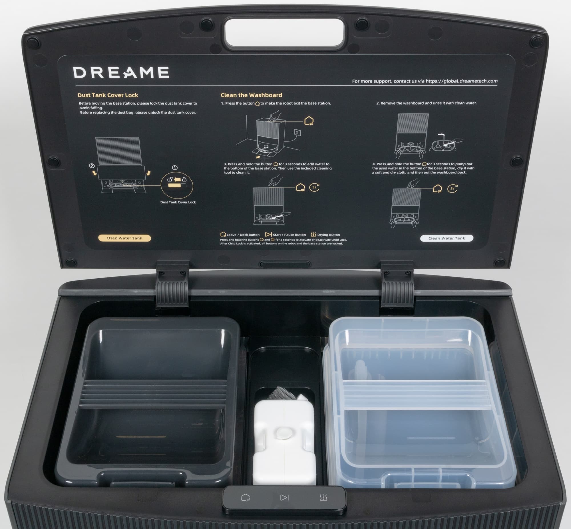 В поддоне док-станции есть углубление, где автоматически промываются моющие валики, а вентилятор в корпусе сушит их теплым воздухом в течение нескольких часов после промывки. Голосовой помощник оповещает об изменениях режима работы, о неисправностях, о необходимости очистки резервуара или заполнения бака для чистой воды, а также напоминает включить самоочистку.
