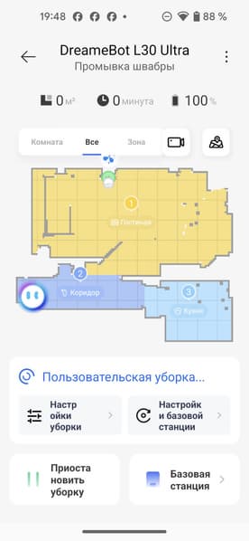 И отдельно надо сказать об особенностях ухода. После завершения уборки надо сразу вылить грязную воду из резервуара и промыть его, залить в него чистую воду, установить пылесос на базу и запустить программу самоочистки. Однако если аккумулятор разряжен или почти разряжен, включить самоочистку не получится, надо подождать полчаса, пока аккумулятор зарядится хоть немного. Тогда надо самостоятельно промыть роторы и контейнер для мусора, иначе появится запах.