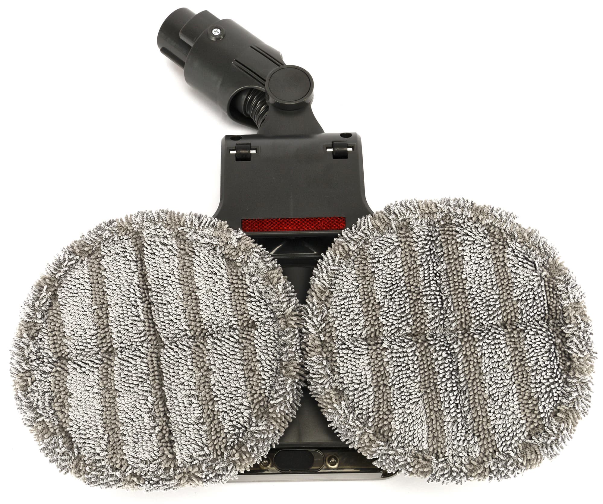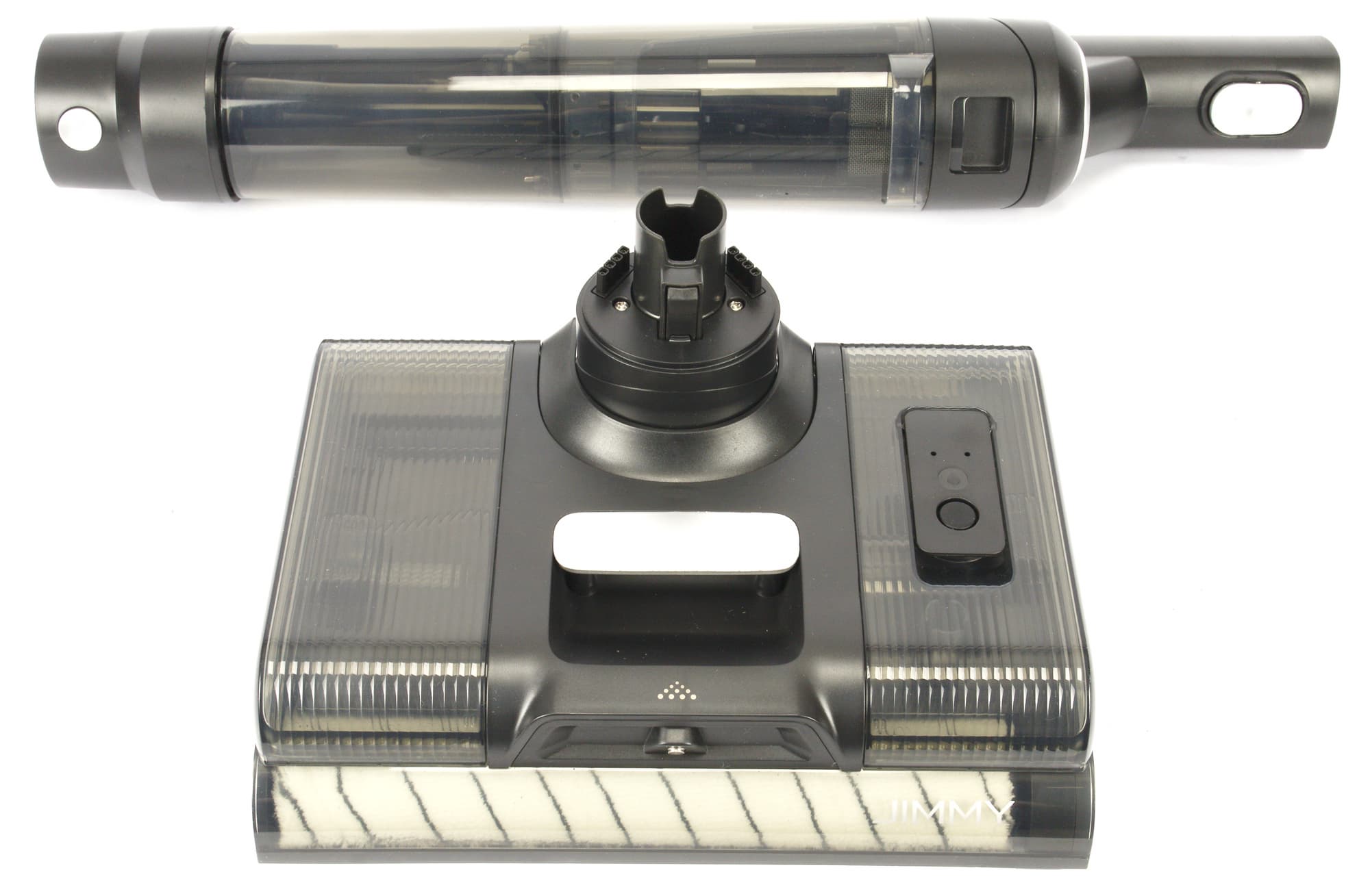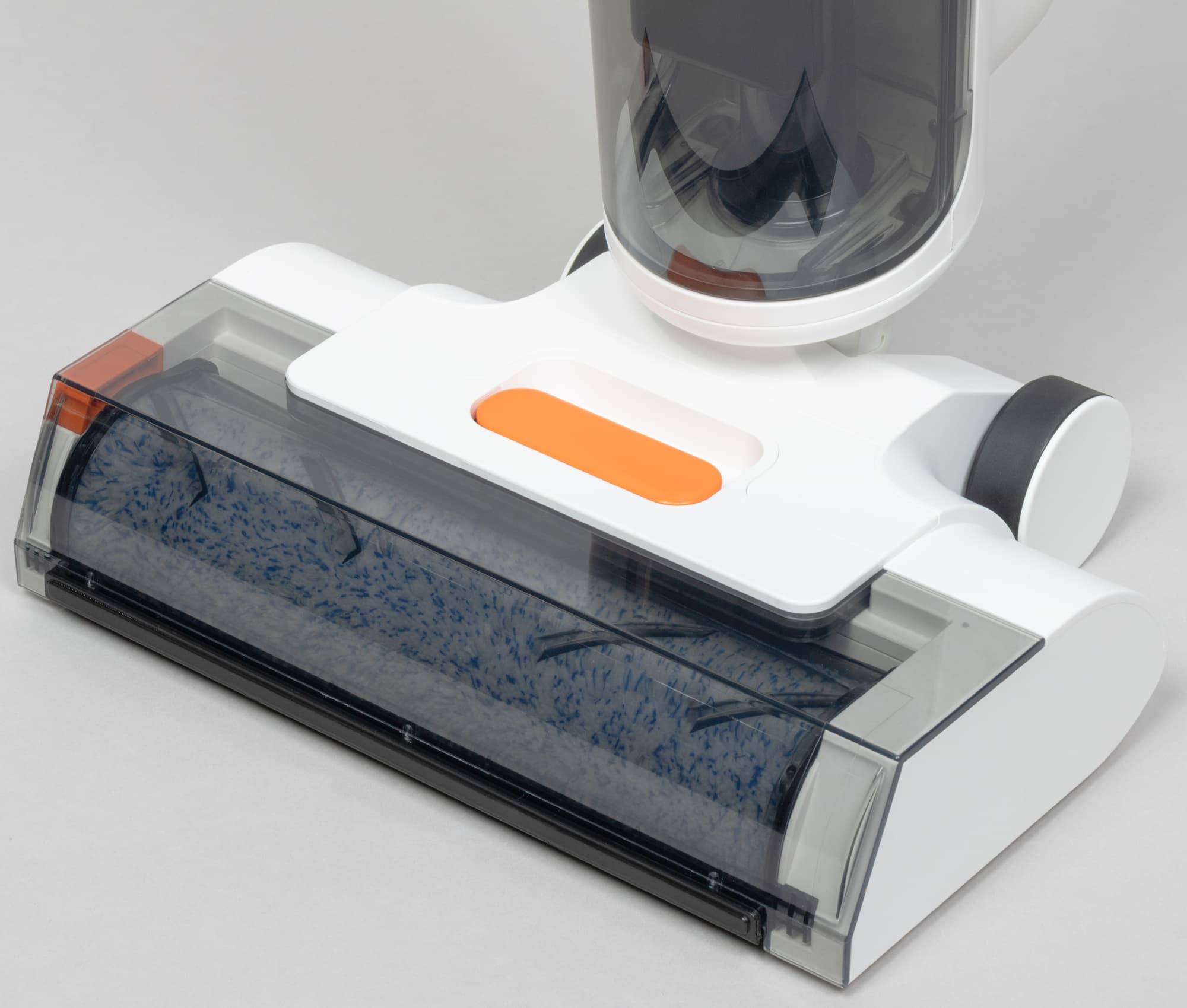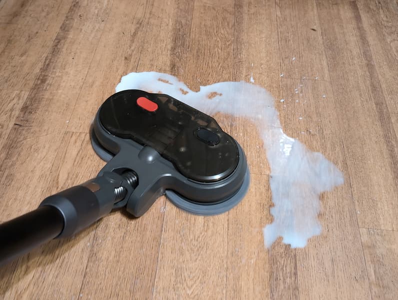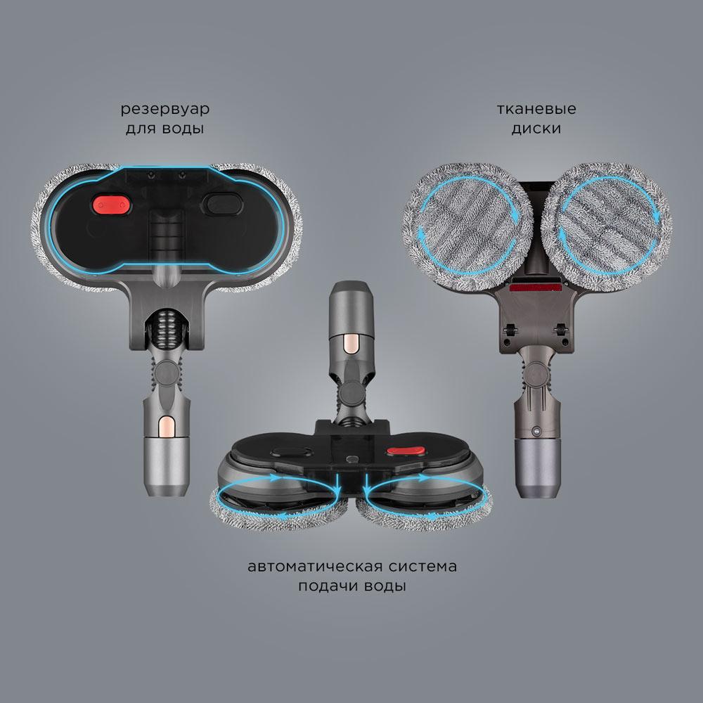 Три конфигурации и один моторный блок — похожую конструкцию мы видели чуть выше, однако насадка для мытья пола в этой модели совершенно иная. Тканевые мопы крепятся к двум вращающимся дискам, над которыми расположен резервуар для воды. Такое встречается у моющих пылесосов-роботов, но в стиках нам встретилось впервые.
