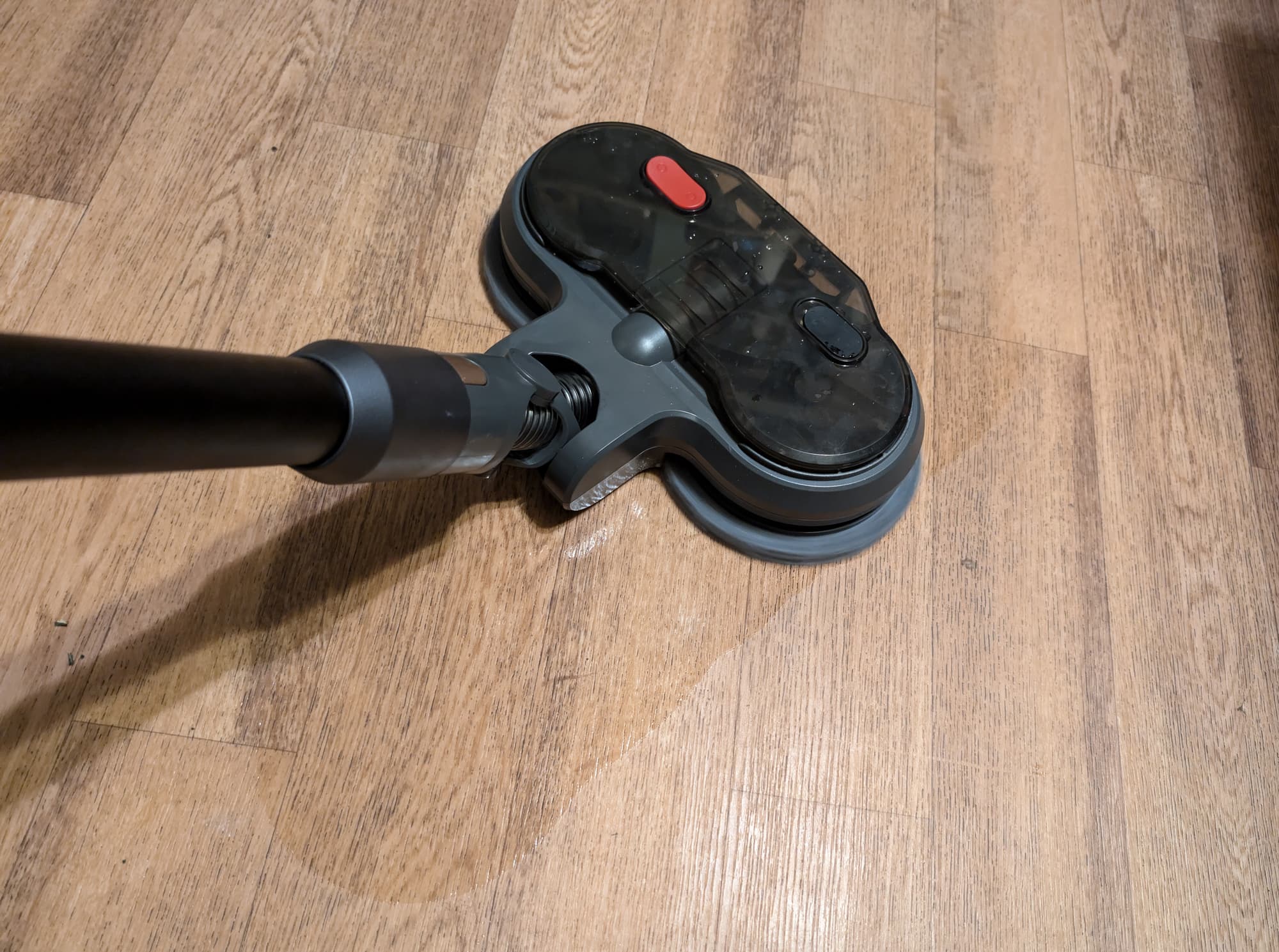 Три режима «Эко», «Стандарт» и «Турбо» переключаются последовательно, есть индикатор уровня заряда. В плане удобства отметили наличие подсветки у насадки для сухой уборки полов и шарнирное соединение трубки, так называемый «гибкий» корпус, которому проще забираться под мебель. Моторизованная насадка для влажной уборки проявила себя хорошо. Вращающиеся диски-мопы лучше протирают пол, чем обычные неподвижные салфетки: во время тестирования удалось удалить стойкие и застарелые загрязнения. Расход жидкости небольшой, да и сам резервуар вмещает всего 235 мл воды. Нам показалось, что перед началом влажной уборки диски нужно дополнительно смочить. Пылесос равномерно, без потеков и разводов протирает (все же тестировщики не использовали здесь слово «мыть», хотя можно было бы!) твердые поверхности. Наш вывод: насадка рассчитана не на глобальное мытье, а на быструю ежедневную влажную уборку с минимумом затрат сил и времени. Впрочем, уличную грязь и разлитую жидкость она тоже уберет.