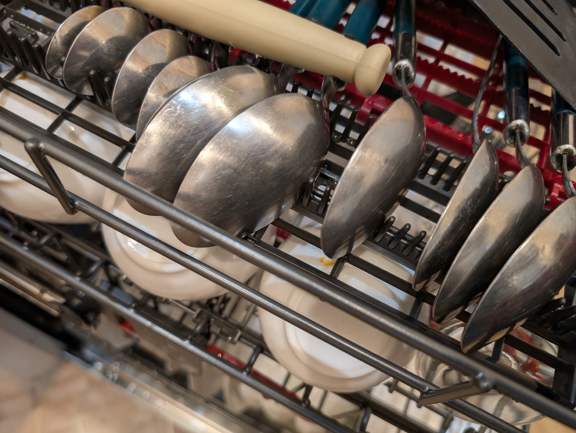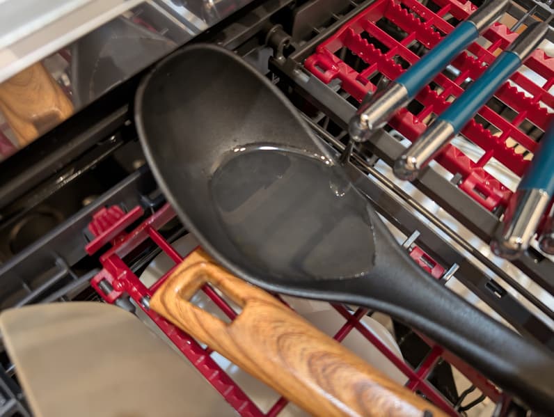 Еще одна ошибка пользователя, на которую мы обратили внимание: в пластиковой ложке, уложенной на верхнюю полку, осталось небольшое количество воды. Этого можно было избежать, если перевернуть прибор.