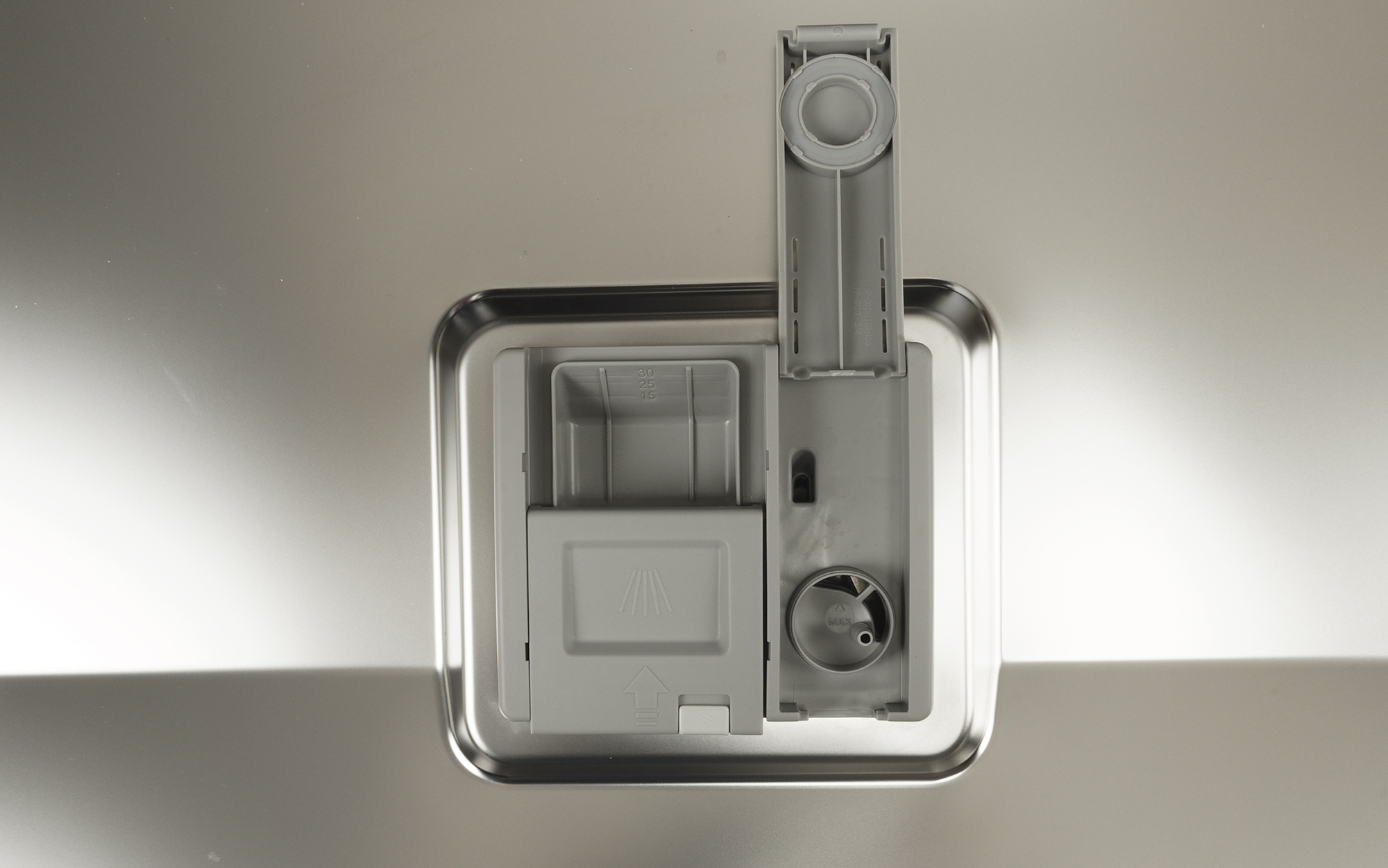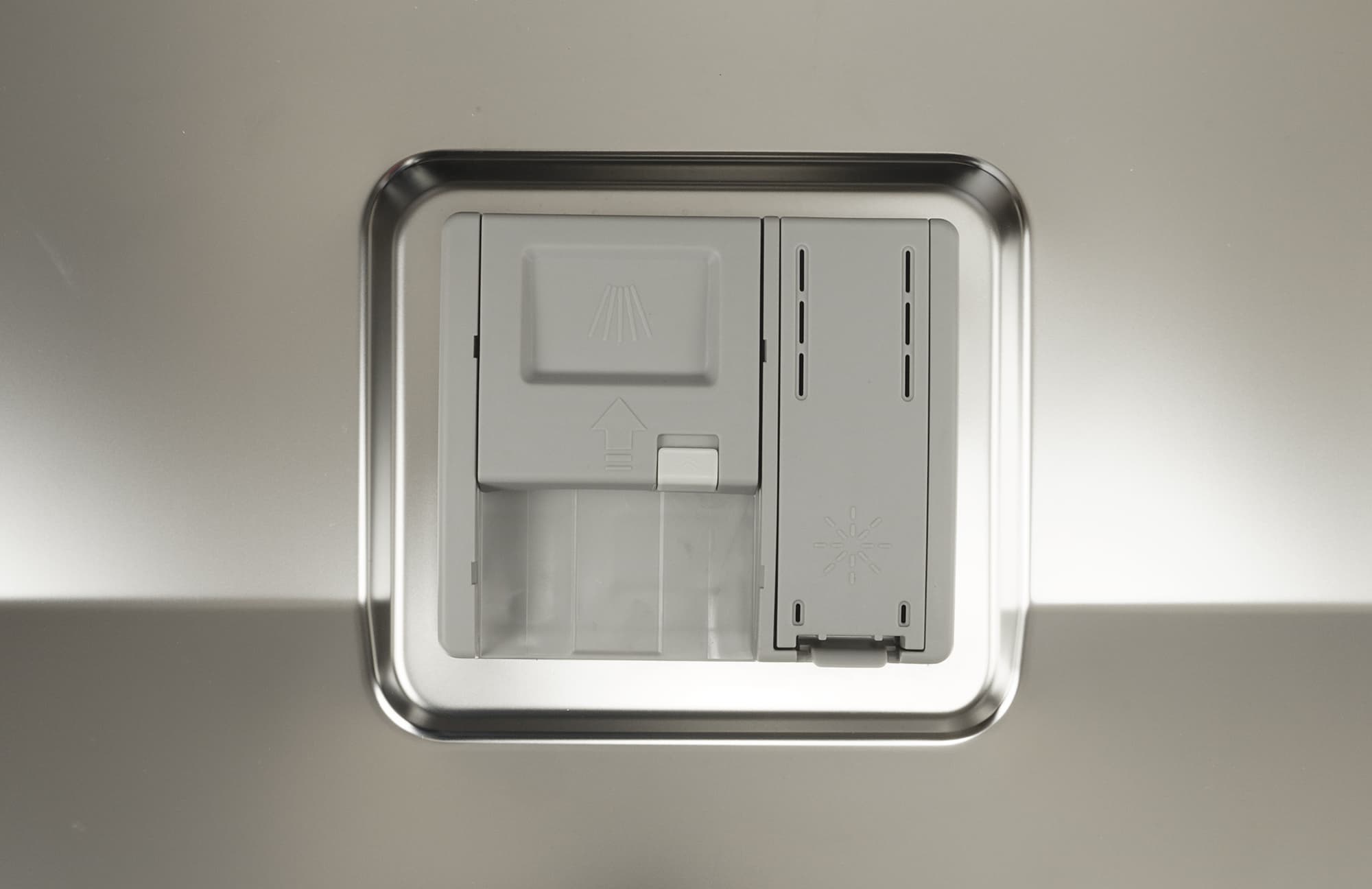 Контейнер для моющих средств состоит из двух частей: большая, со сдвижной заслонкой, предназначена для порошка и таблеток, а в меньшей за откидывающейся крышкой скрывается резервуар для ополаскивателя.