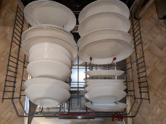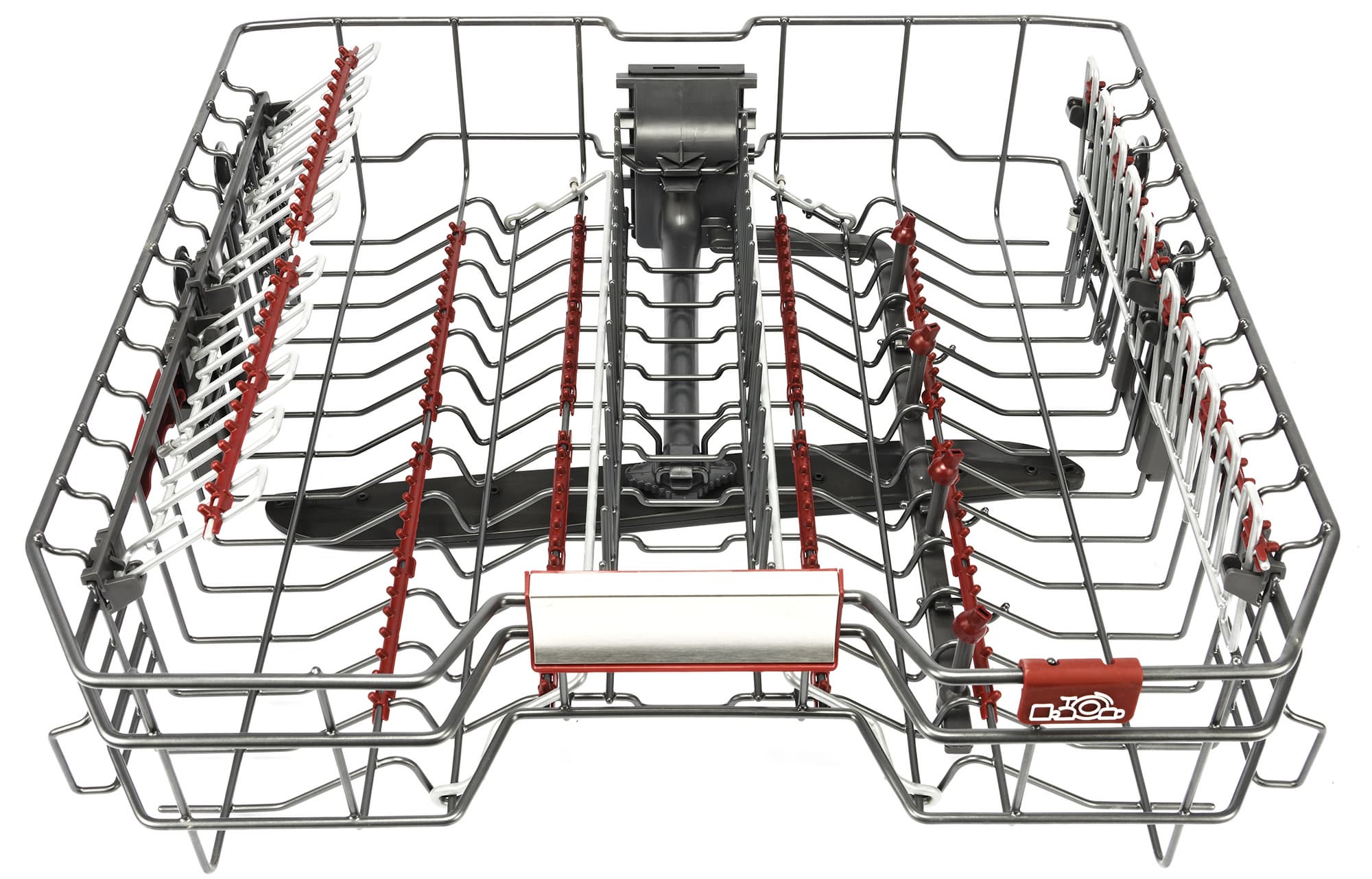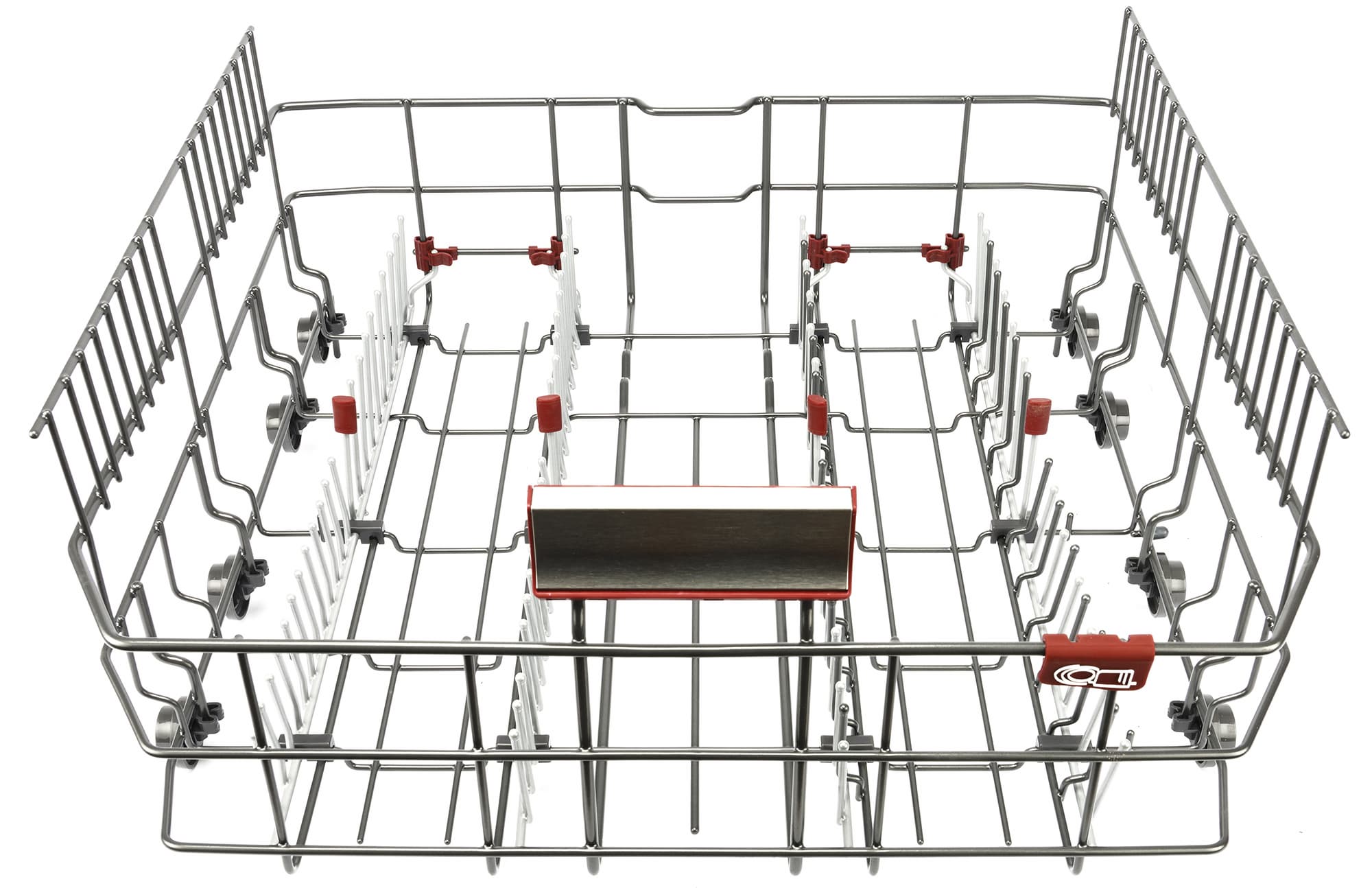 По краям средней корзины расположены откидные полки для чашек и ножек бокалов. В центре расположены ряды неподвижных направляющих для блюдец и десертных тарелок. Справа и слева от них производитель добавил по ряду откидных стоек: вместо одного ряда блюдец можно расположить два. На металлических элементах корзины предусмотрены мягкие накладки, защищающие посуду от царапин.