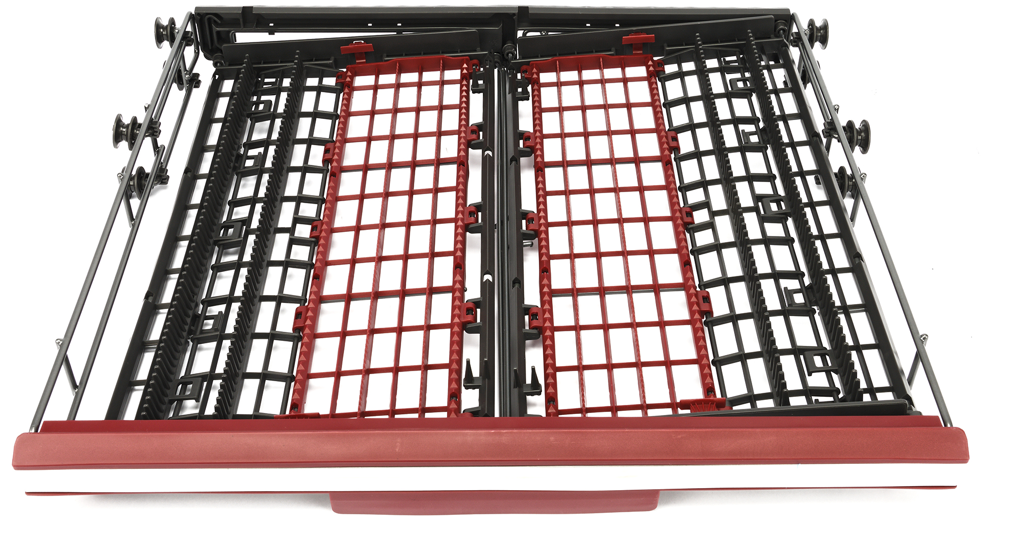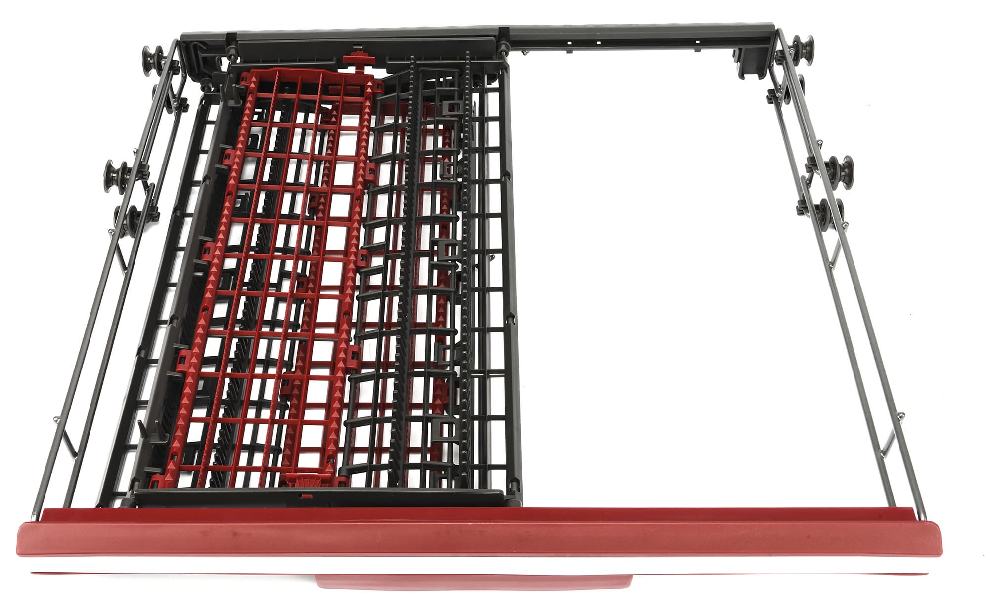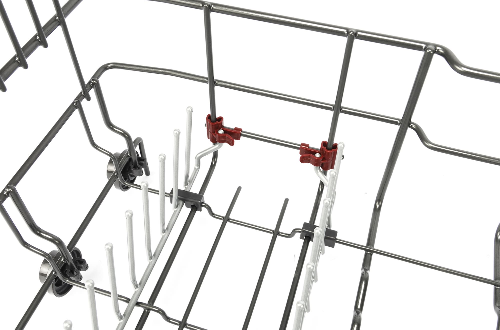 Левый ряд направляющих полностью складывается: это поможет разместить на дне корзины большие кастрюли, формы для выпечки и другую крупногабаритную посуду. Складные элементы в правом ряду чередуются с неподвижными элементами: это пригодится при мытье в вертикальном положении глубоких мисок и больших суповых тарелок. Подвижные элементы отличаются по цвету от основной конструкции корзины: они окрашены более светлой эмалью.
