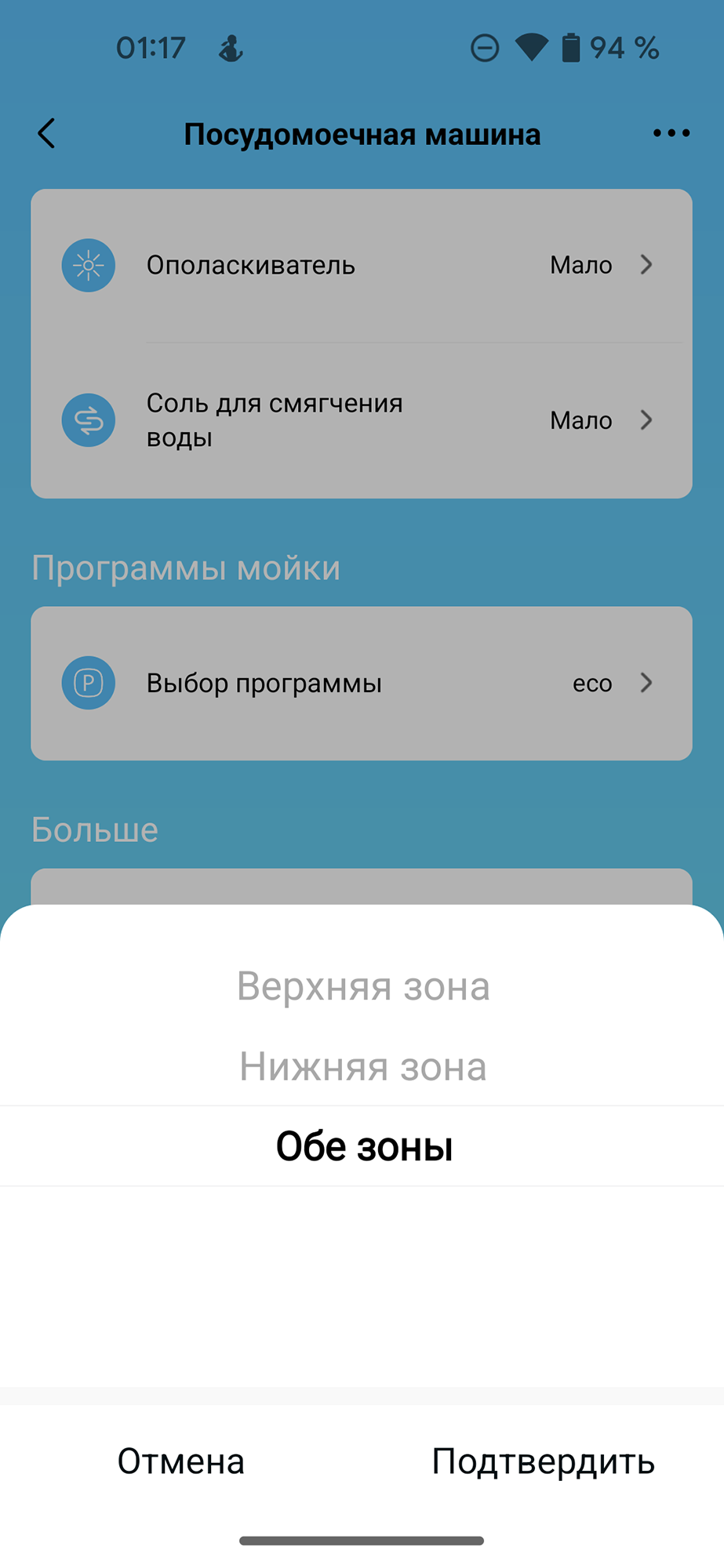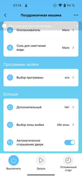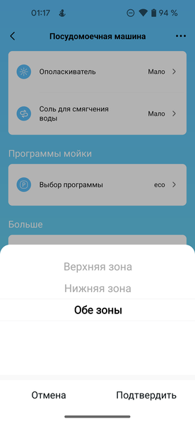 В отличие от панели управления, приложение позволяет управлять подачей воды: мы можем выбрать мытье посуды в верхней, или нижней зонах или включить обе зоны (по умолчанию).