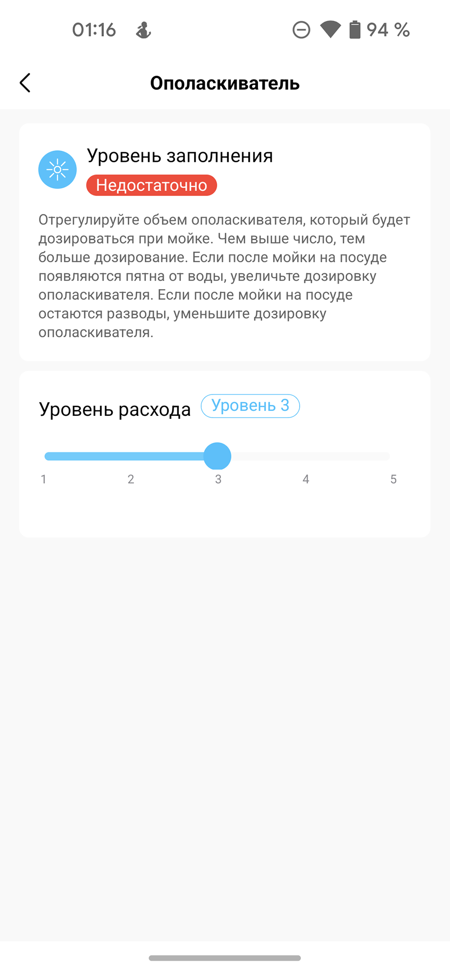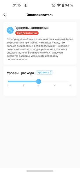 Установки жесткости воды и расхода ополаскивателя также можно изменить в соответствующем меню мобильного приложения.