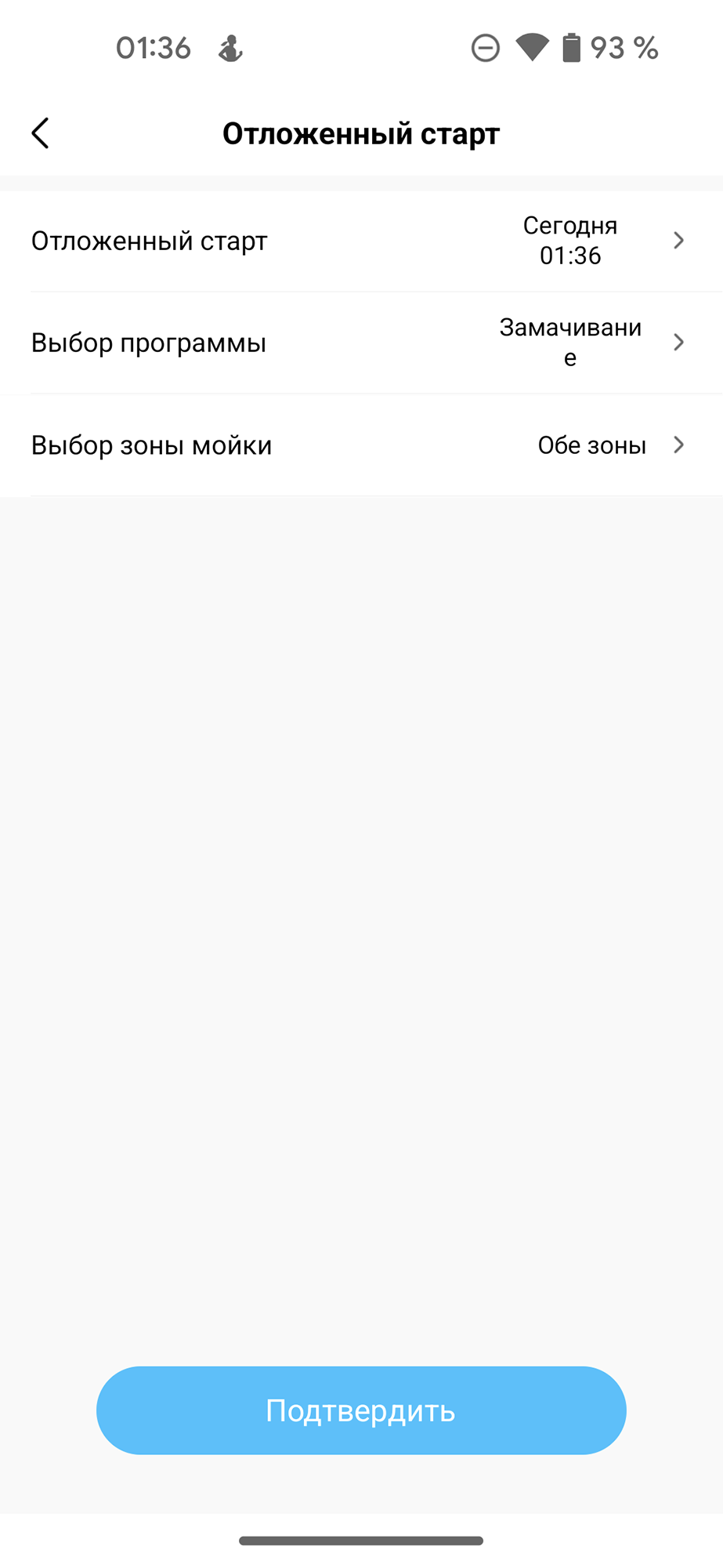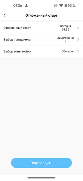 В меню «Отложенный старт» можно настроить запуск посудомойки с точностью до минуты (а не с шагом в 1 час, как на панели управления), выбрать нужную программу и указать зону мойки.