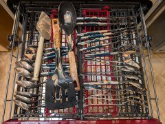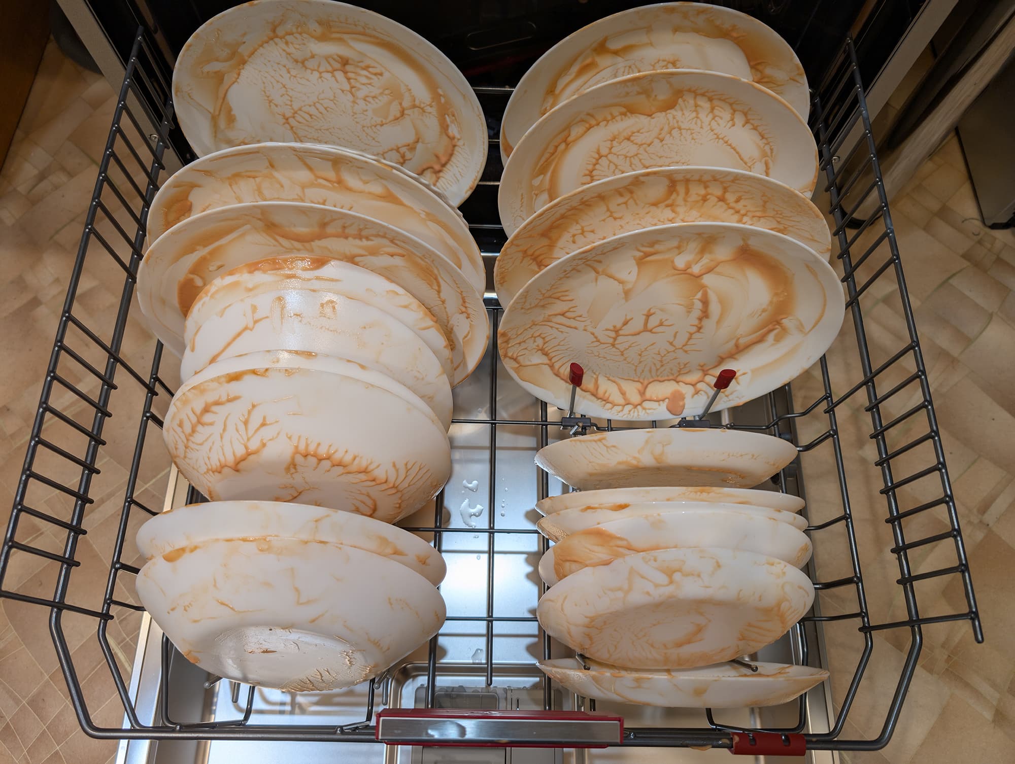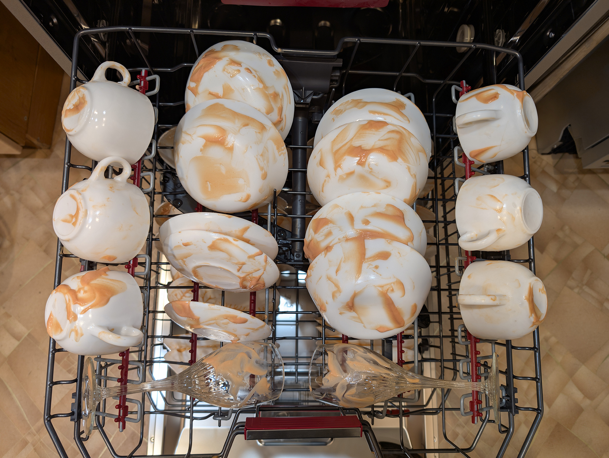 Как обычно, в ход пошла идеальная грязь: простая смесь майонеза и кетчупа — но есть некоторые нюансы. Посуду, которую мы густо ею покрыли, засыхала в течение суток. После этого мы разместили ее в корзинах и на полке для столовых приборов, не слишком заботясь об аккуратности расстановки.