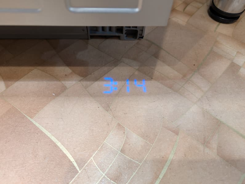 Вместо традиционного «красного луча», извещающего о выполнении программы, Toshiba DW-16B1(B)-RU проецирует на пол время, оставшееся до конца сценария. Крупные, яркие и контрастные голубые цифры выглядят необычно и отлично читаются при любом освещении. Такое решение значительно информативнее, чем привычное большинству пользователей красное пятно на полу: здесь пользователь сразу видит, сколько времени осталось до разгрузки посудомойки.